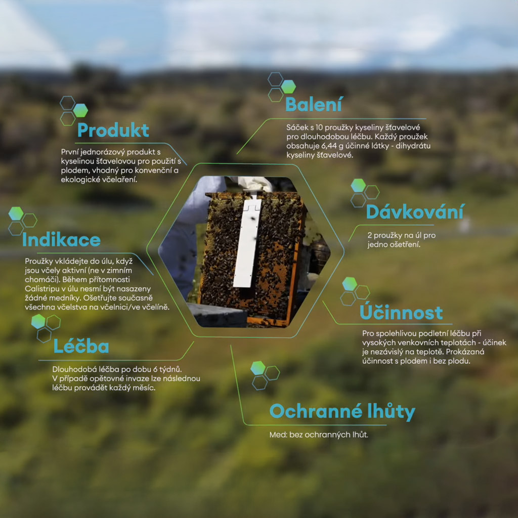 - Je přípravek bezpečný pro včely?Ano, Calistrip Biox je šetrný ke včelám. Účinná látka se distribuuje mezi včelami přirozeně – vzájemným kontaktem a čisticím chováním. Přípravek nevyžaduje zvláštní ochranné lhůty na med.