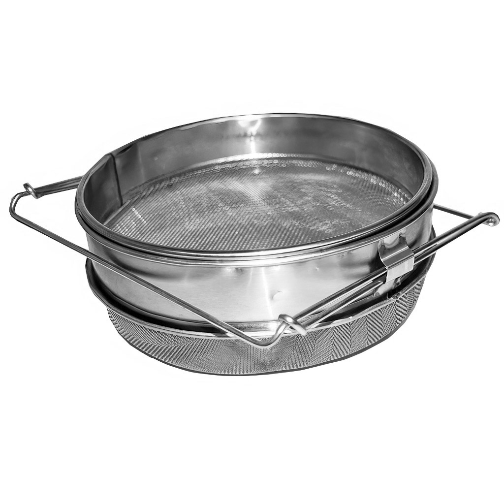 Dvojitý nerezový cedník slouží k primární filtraci medu bezprostředně po vytočení. Horní ploché síto (2 x 2 mm) separuje hrubé příměsi – zlomky víček, kousky díla a větší voskové částice. Spodní vypouklé síto (1 x 1 mm) provádí jemnou filtraci. Vypouklý tvar spodního síta zvyšuje filtrační plochu a zpomaluje zanášení, což je výhodné zejména při zpracování většího objemu medu. Výsuvné držáky zajišťují stabilní usazení na nádobách bez nutnosti přidržování. Nerezové provedení je odolné vůči organickým kyselinám obsaženým v medu a splňuje hygienické požadavky pro styk s potravinami. Po použití postačí oplach teplou vodou.