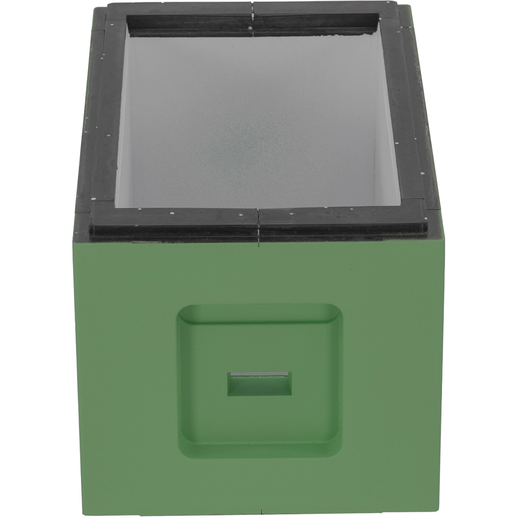 Na vnějších stěnách jsou vyfrézované ergonomické úchyty pro pohodlné a bezpečné přenášení i při plném zatížení. Polodrážka na hranách zajišťuje stabilní dosednutí nástavků, omezuje posouvání sestavy a pomáhá chránit úl před zatékáním a nežádoucí vlhkostí.