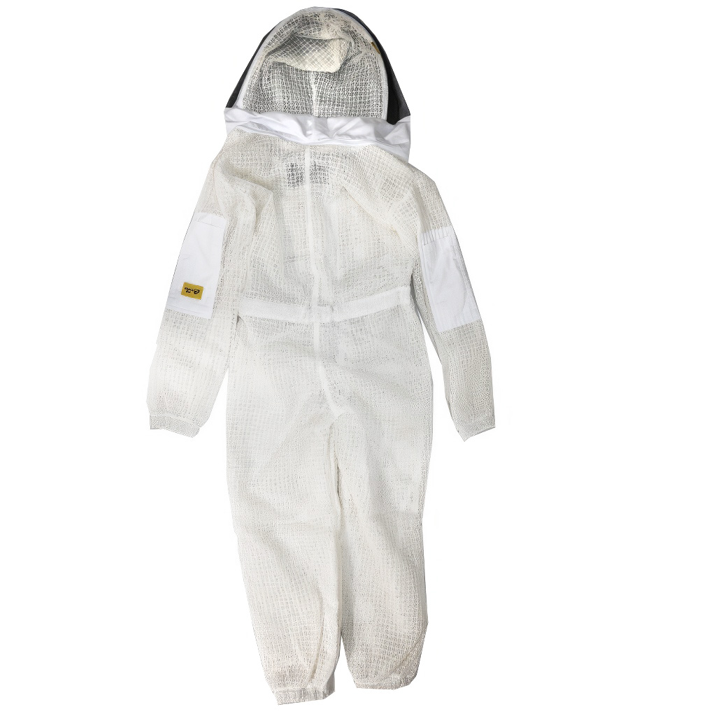 Chcete vzít své dítě s sebou ke včelám a nemáte z toho dobrý pocit? Přesně pro to je tahle kombinéza. Je to vlastně celý overal i s kapucí se síťkou přes obličej, všechno v jednom kuse. Dítě do něj vleze, zapne zip a je chráněné od hlavy až k patám – žádná včela se dovnitř nedostane.