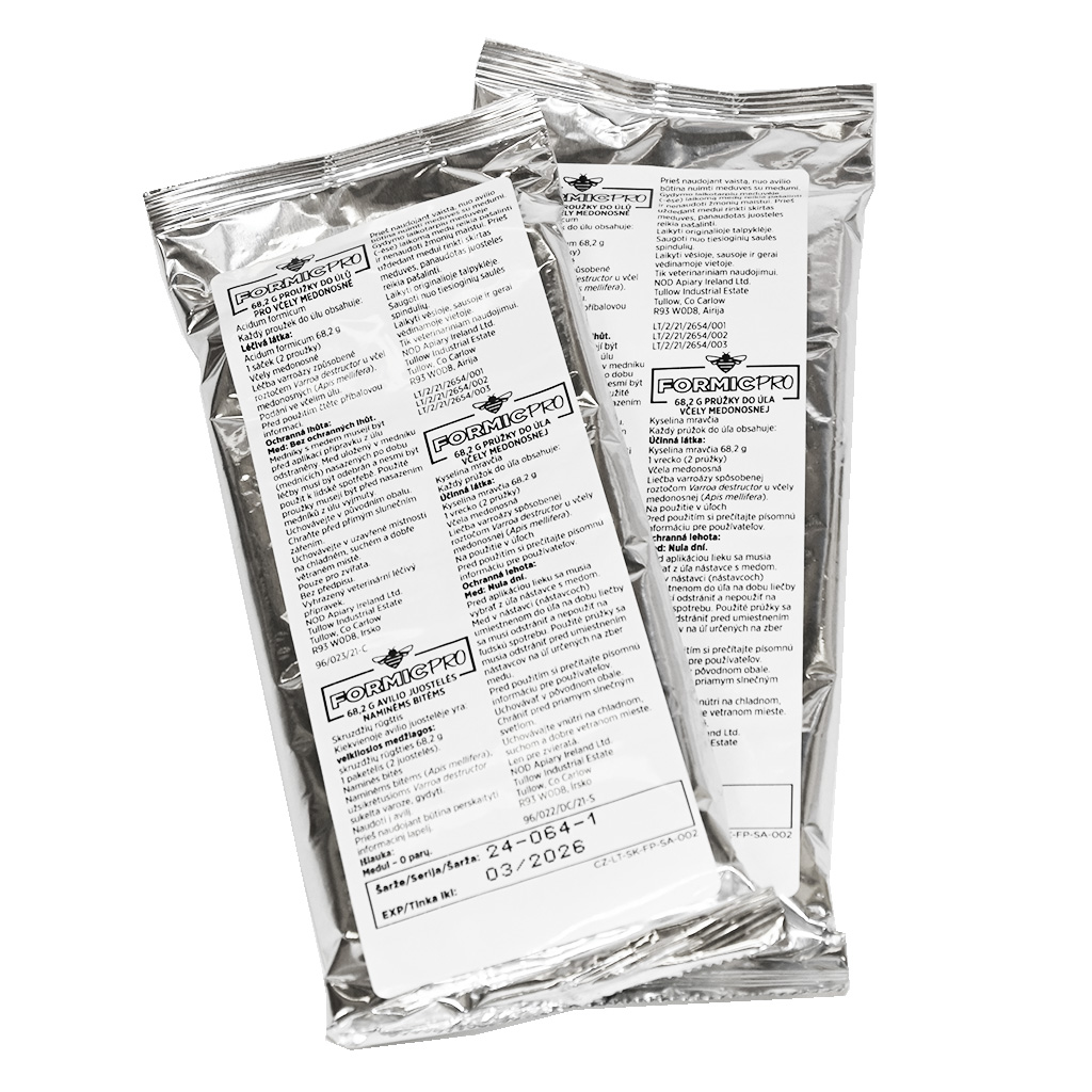 - Je FormicPro vhodný pro ekologické včelaření?Ano. Kyselina mravenčí je látka přírodního původu, která je kompatibilní s principy ekologického včelaření. Navíc je obal proužků biologicky rozložitelný a po použití jej lze kompostovat.