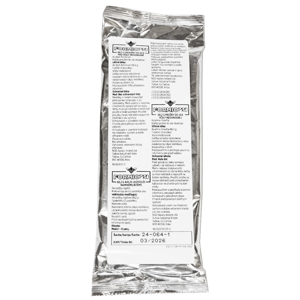 Formicpro představuje účinné řešení na přírodní bázi určené ke spolehlivé kontrole roztoče Varroa destructor ve včelstvech. Každý proužek obsahuje 68,2 g kyseliny mravenčí (Acidum formicum) ve formě gelu obaleného v biologicky rozložitelném laminovaném papíru. Tento materiál v úlu funguje jako knot, který kontrolovaně uvolňuje účinnou látku po celou dobu léčby.
