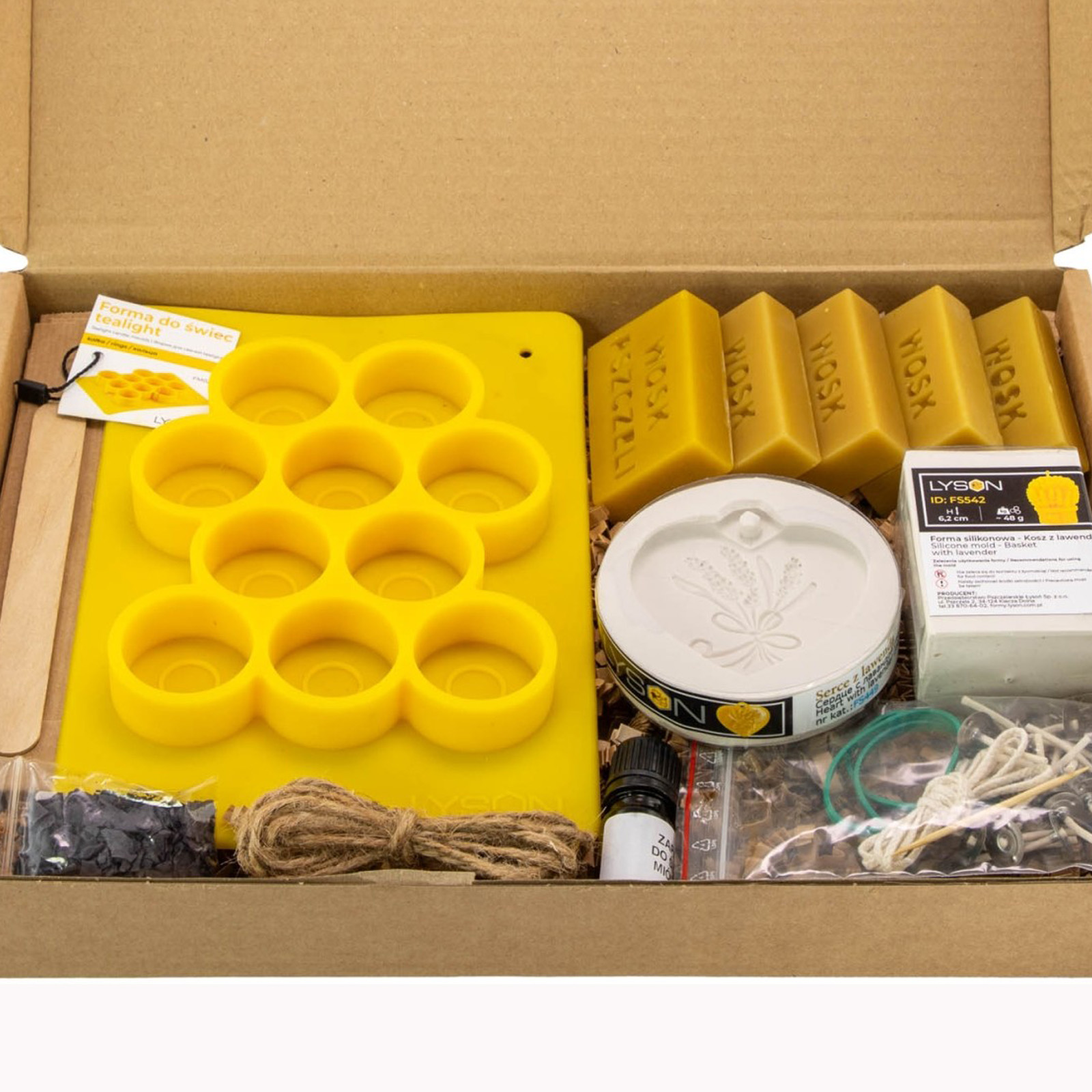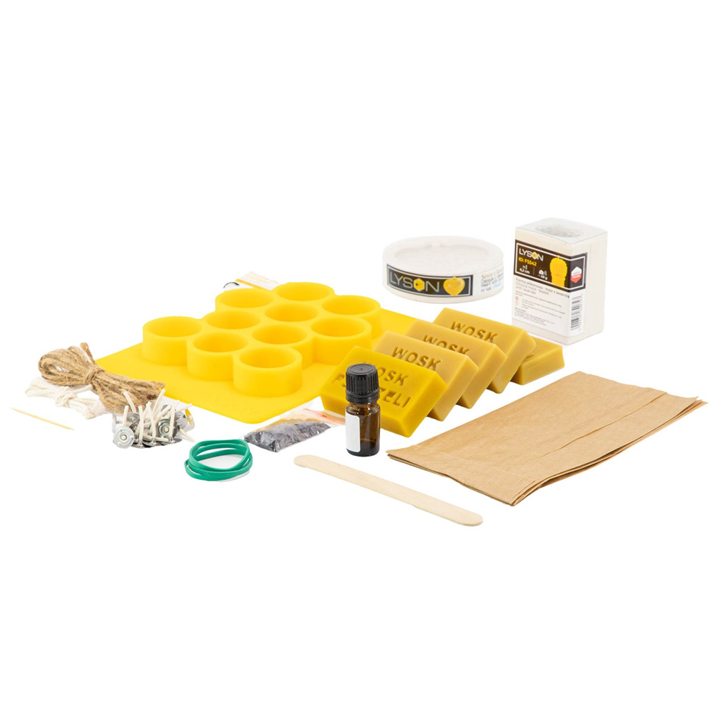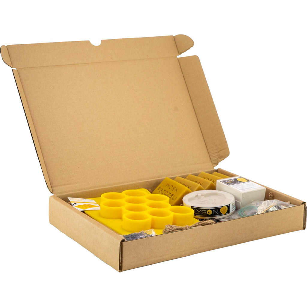 V balení najdete vše, co potřebujete pro okamžitý start vašeho včelařského tvoření: 250 g čistého včelího vosku (rozděleného do 5 bloků po 50 g), tři různé formy (čajová svíčka, silikonový košík s levandulí a srdce s levandulí), fialové barvivo pro autentický vzhled a 5 ml čistého levandulového vonného oleje. Nezapomněli jsme ani na technické detaily: metr bavlněného knotu, 20 hotových knotů s plíškem, dřevěnou špachtli, párátko, gumičky pro fixaci forem a dekorační prvky jako jutový provázek, dárkové sáčky a papírovou výplň.