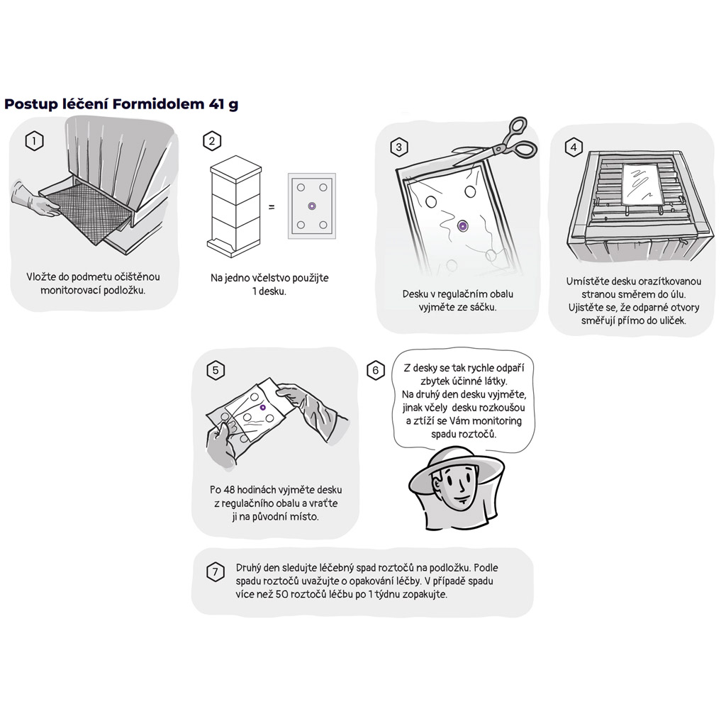 - Na co si dát pozor při aplikaci Formidolu za vysokých teplot?Pokud denní maximální teploty přesahují 25 °C, desky nevkládáme ani neodstraňujeme regulační obal po poledni, kdy je teplota i provoz na česně maximální. Aplikaci provádíme ráno nebo večer po uklidnění včelstva, aby nedošlo k poškození včel nadměrným odparem.
