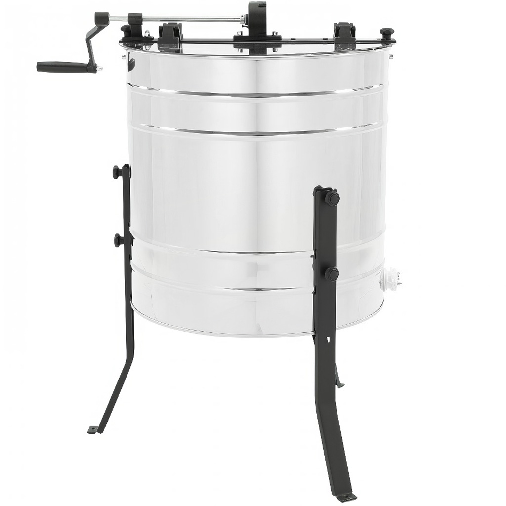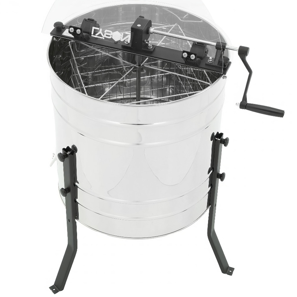 Tento medomet pojme najednou 4 plásty, takže nemusíte vytáčet po jednom a práce jde rychleji. Je vyrobený z nerezové oceli, což znamená, že se snadno myje a nerezaví. Nahoře má průhledný kryt z plexiskla, takže vidíte, co se uvnitř děje, a zároveň vám med neodlétává ven.