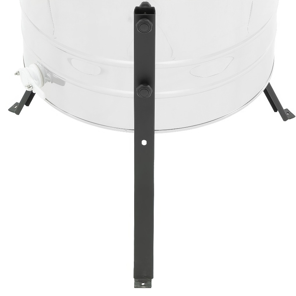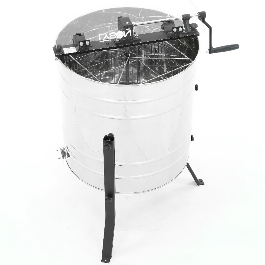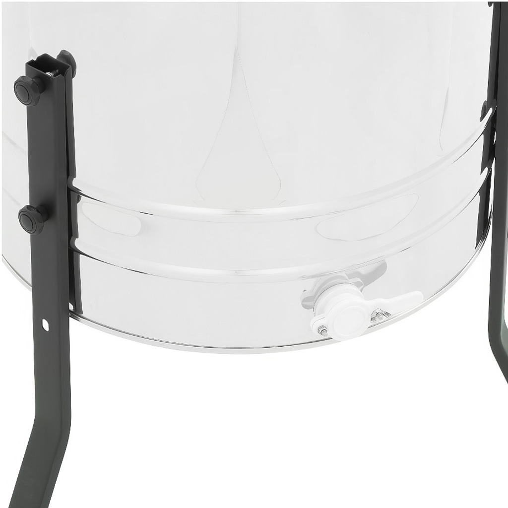 Buben je vyroben z kvalitní kyselinovzdorné nerezové oceli (0H18N9), která je vhodná pro styk s medem, snadno se čistí a vyniká dlouhou životností. Koš tvoří pevné nerezové tyče s oky 25×70 mm – hustota výpletu pomáhá chránit plásty před lámáním a deformací i při vyšších otáčkách. Průhledné víko z 3mm plexiskla (metaplexu) umožňuje bezpečně kontrolovat průběh vytáčení bez nutnosti medomet otevírat.