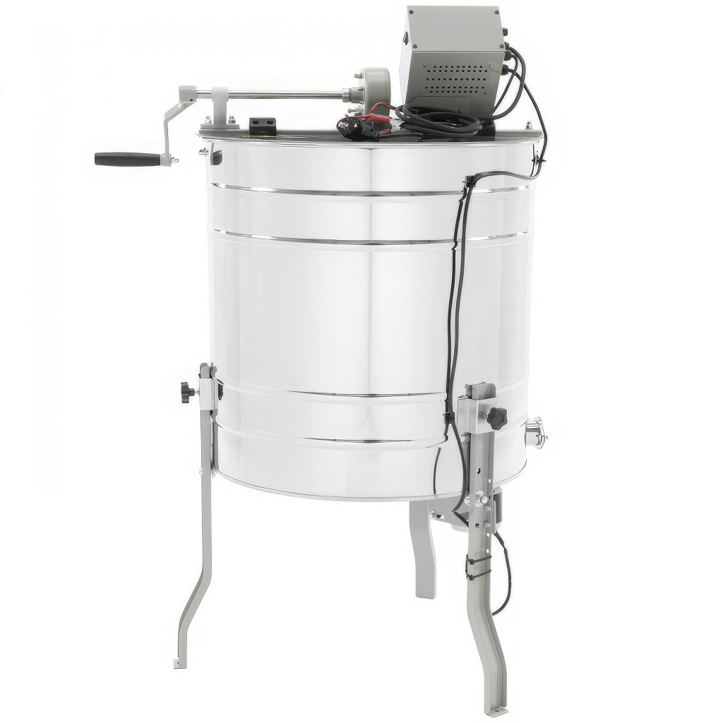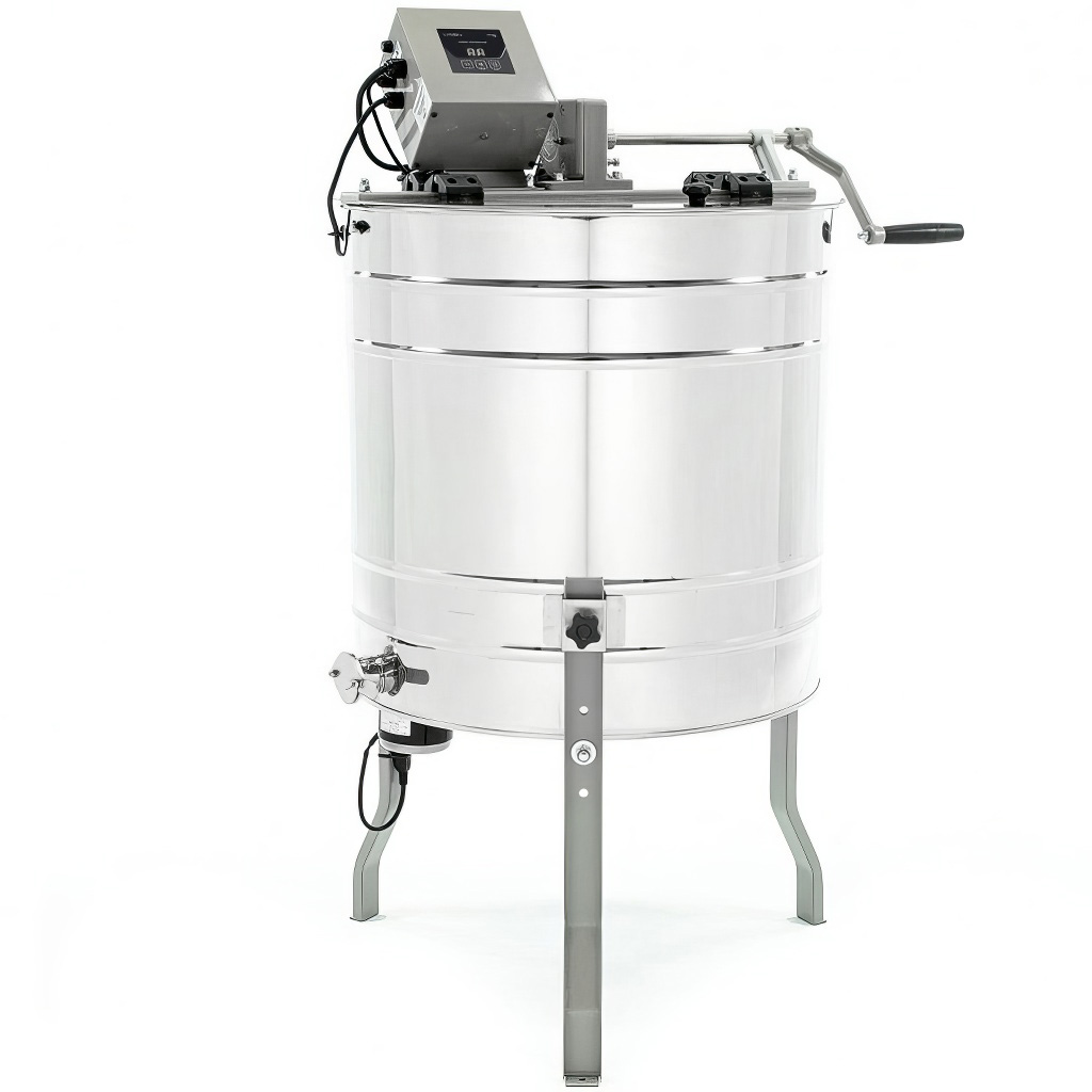 Model je navržený tak, aby šetřil čas i síly při práci na včelnici. Velkým benefitem je kombinovaný pohon (ruční + elektrický) – medomet lze napájet jak z 230 V v medárně, tak z 12 V například z autobaterie na kočovném stanovišti. Když dojde k výpadku proudu, plynule navážete ruční klikou s brzdou. Elektrický pohon s ovládáním přes digitální potenciometr (CDD) umožňuje plynulou regulaci otáček, takže během vytáčení můžete v klidu odvíčkovávat další rámky.