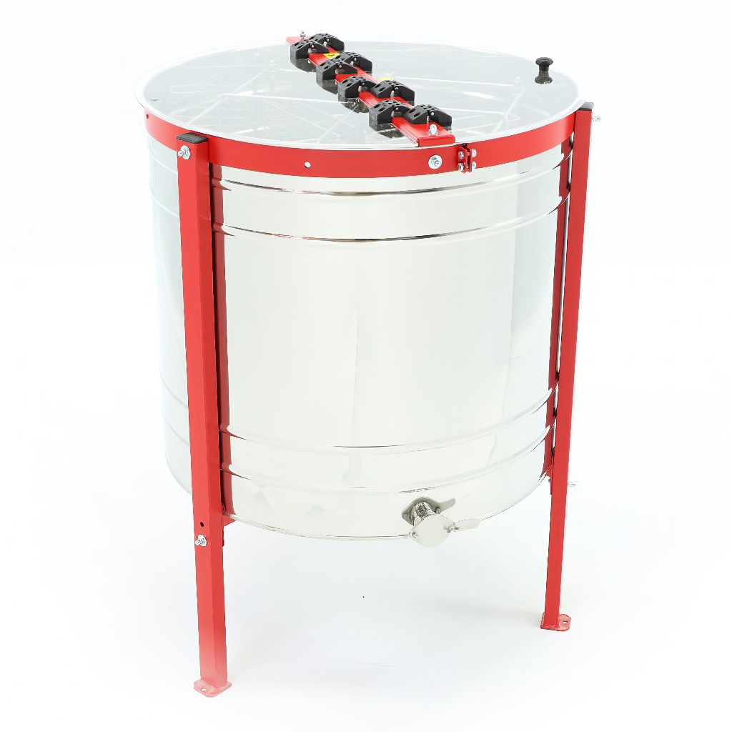 - Kolik rámků lze vytáčet najednou?Medomet je šestirámkový – do kazetového koše lze vložit 6 rámků současně. Průměr bubnu činí 800 mm, což zajišťuje dostatečný prostor pro plynulé vytáčení.