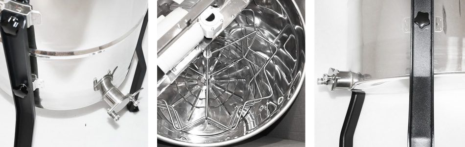 Celý medomet je vyrobený z nerezové oceli, která je bezpečná pro styk s potravinami a dá se snadno umýt. Drátěné košíky uvnitř mají hustou mřížku, takže se do pláství nezařezávají a neničí je – včely je pak mohou znovu použít, což vám ušetří práci i čas. Dno medometu je šikmé a med po něm sám stéká ke kohoutku. Nemusíte medomet naklánět ani s ním nějak manipulovat, prostě otevřete kohoutek a med teče ven celý, do poslední kapky.
