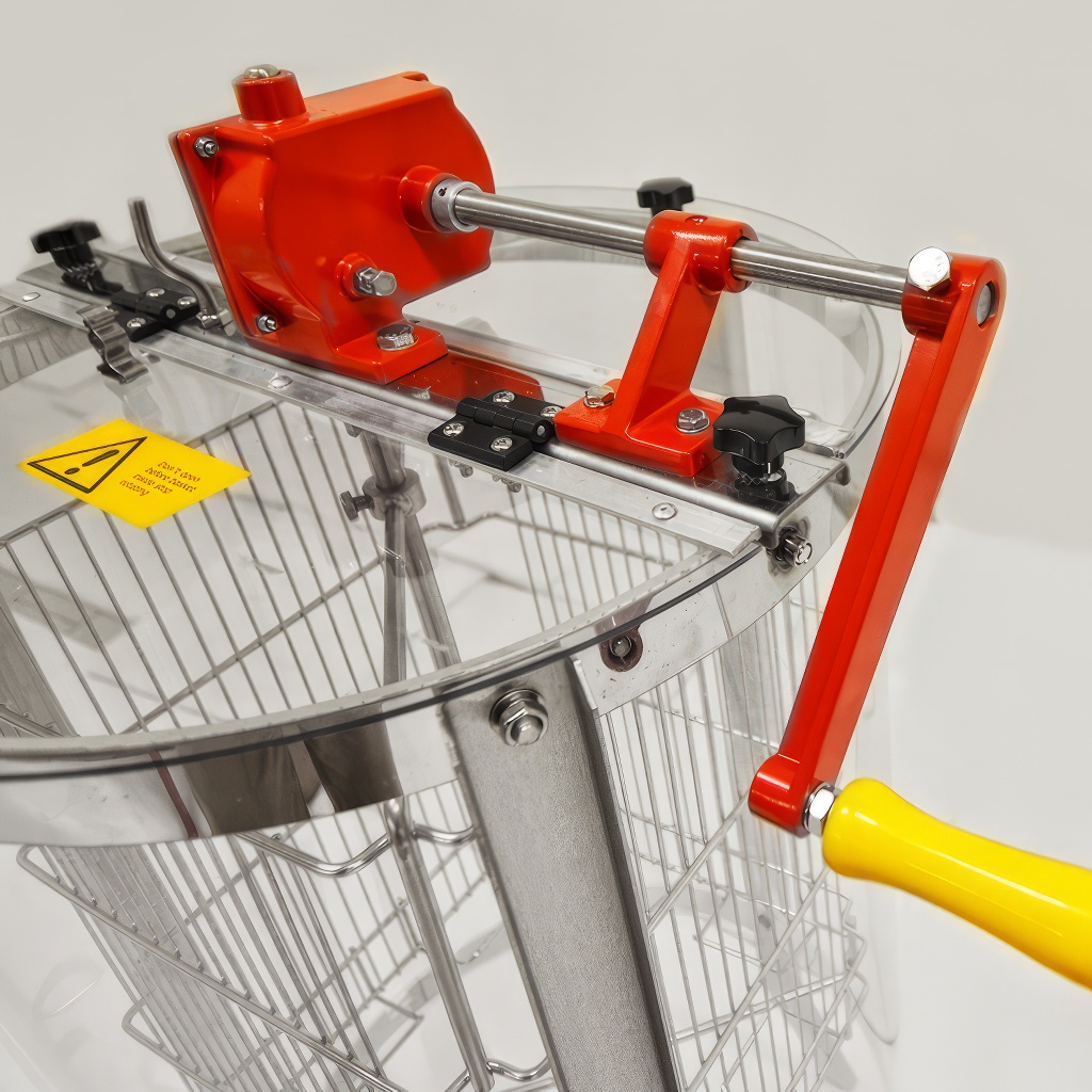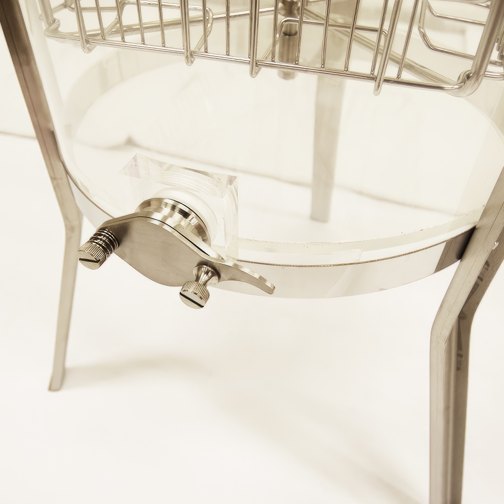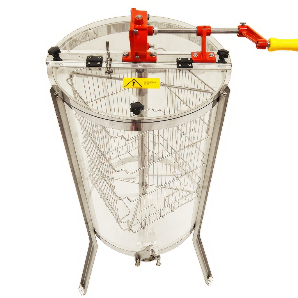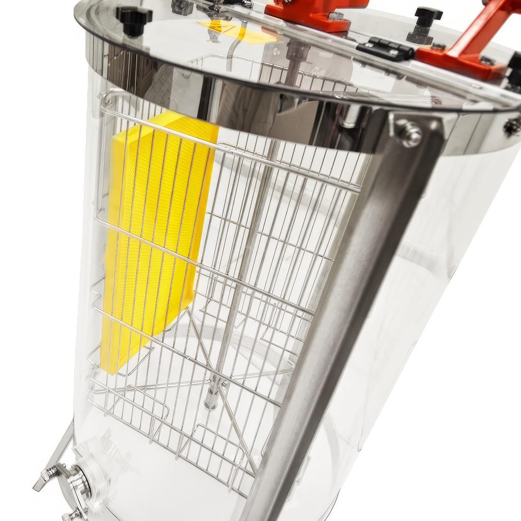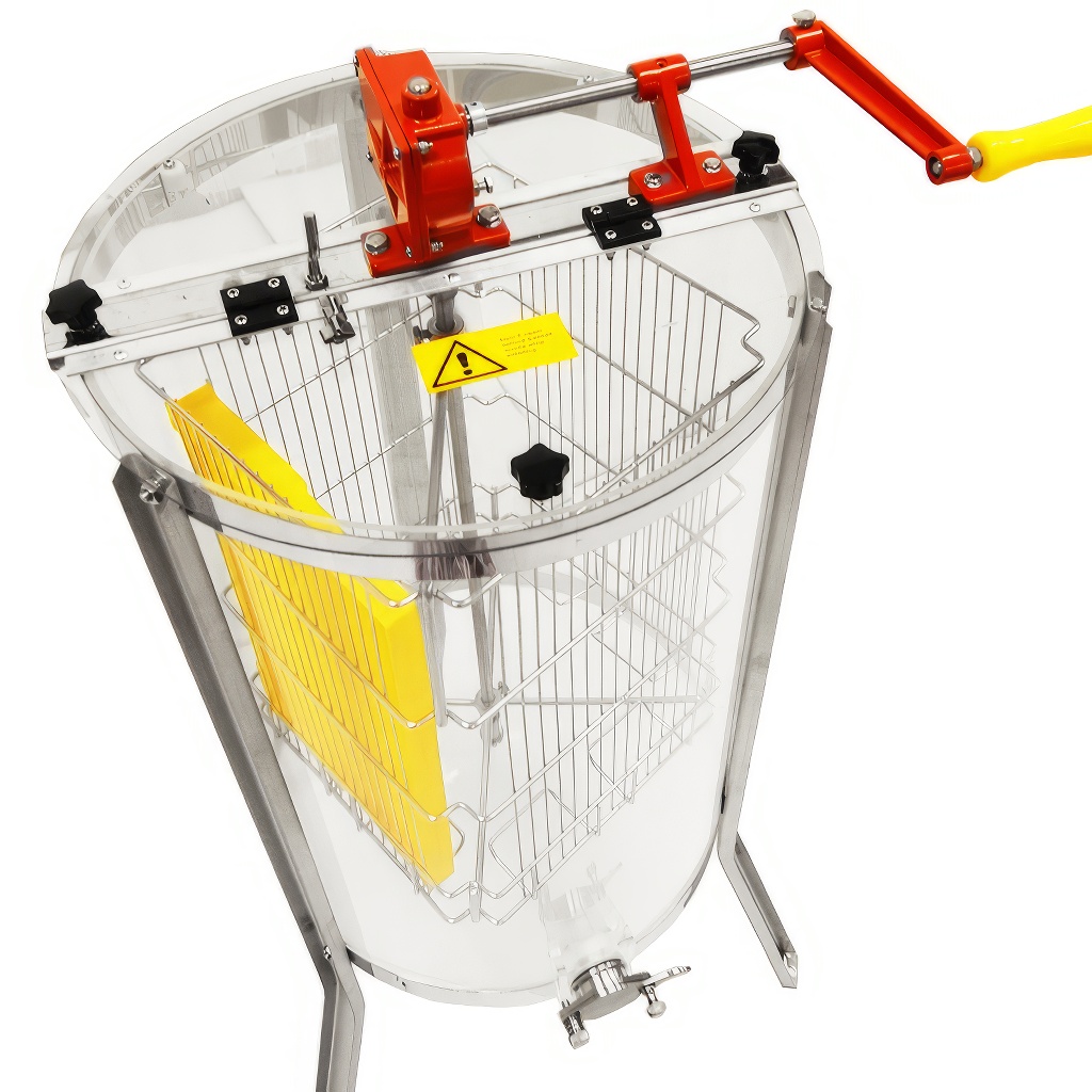 Tento medomet oceníte všude tam, kde chcete, aby bylo vytáčení medu viditelné. Celý plášť z vysokopevnostního plexiskla umožňuje sledovat celý proces vytáčení, což z něj dělá ideální volbu pro včelařské kroužky, výukové akce, výstavy nebo ukázky pro veřejnost. Ruční pohon s velkou klikou zajišťuje plynulý a pohodlný chod bez nutnosti elektrického připojení. Konstrukce vychází z osvědčených německých standardů, díky čemuž je medomet plně kompatibilní s příslušenstvím značek jako Holtermann, Fritz, Logar nebo Biene Ruck. Praktický je i snadno demontovatelný výpustný kohout, který zjednodušuje čištění po každém vytáčení.