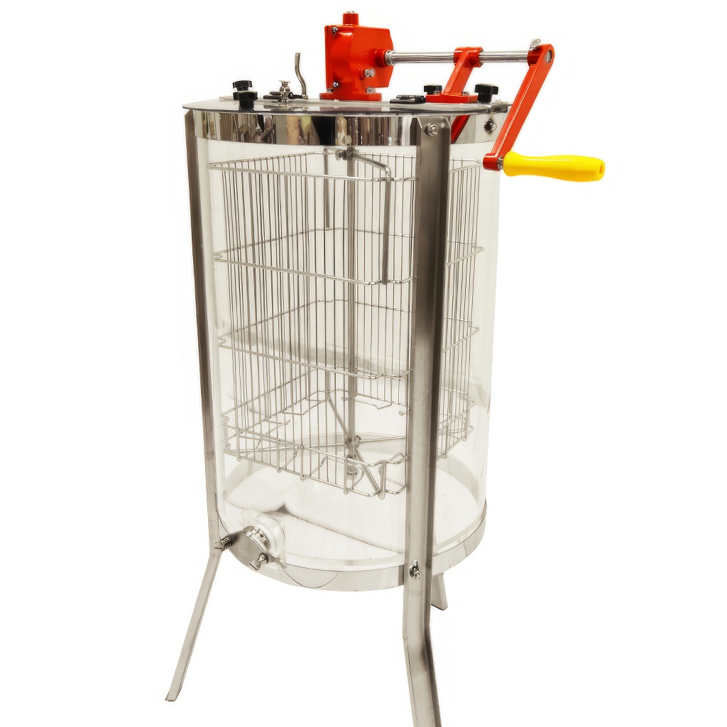 Čtyřrámkový tangenciální medomet, který má celý plášť vyrobený z vysokopevnostního plexiskla. Vhodný pro výuku, dětské včelařské kroužky, na výstavy a všude tam, kde máte při vytáčení medu diváky. Kvalitní medomet osvědčené německé konstrukce, tak jak ji můžete znát od značek jako H. Holtermann, C. Fritz, Logar, Biene Ruck a další. Průměr bubnu je 45 cm. Medomety Mellarius používají stejné kliky jako zmíněné značky a mají řadu stejných prvků. Medomet má buben z plexiskla, ostatní součásti jsou z nerezu. Výpustný kohout je plastový, lze jej snadno odšroubovat a důkladně omýt, na vyžádání lze zajistit medomet i nerezovým kohoutem.