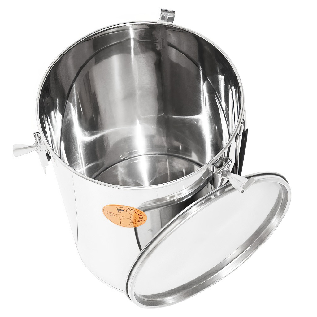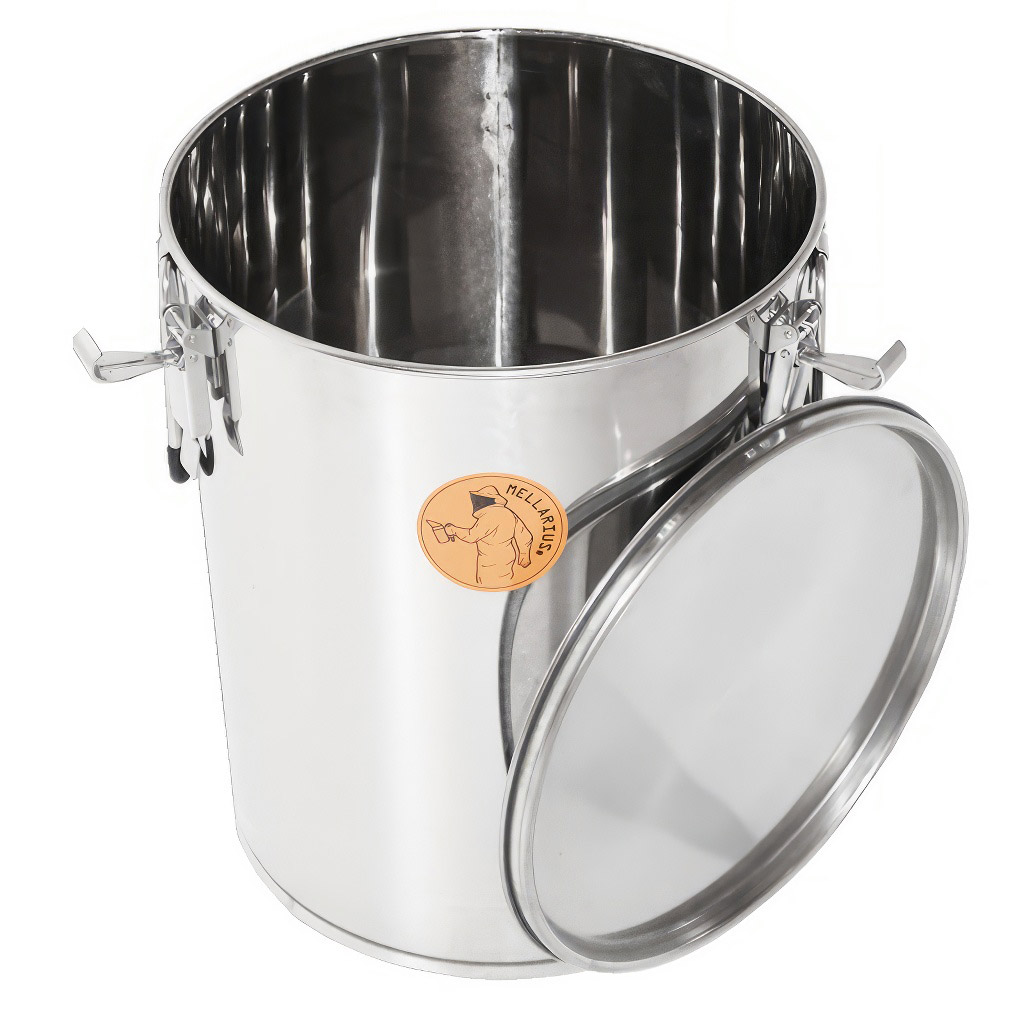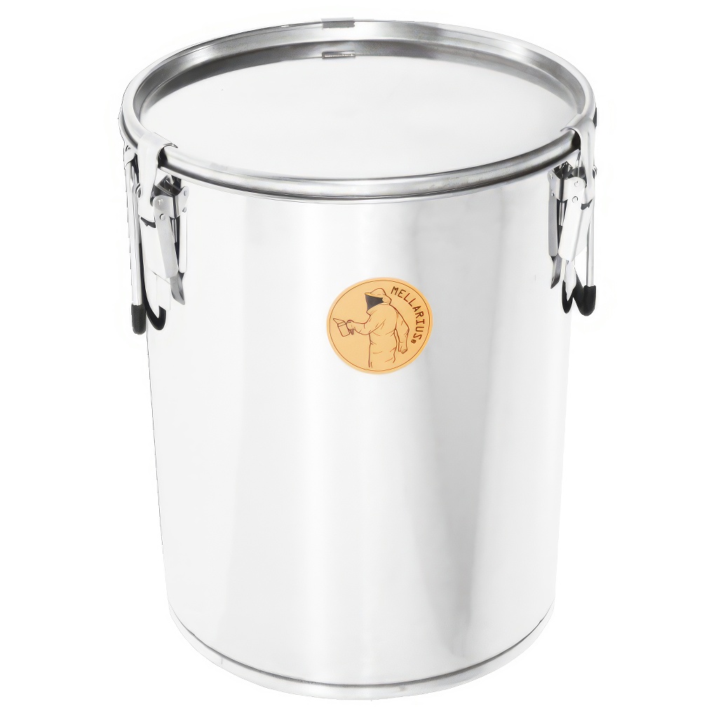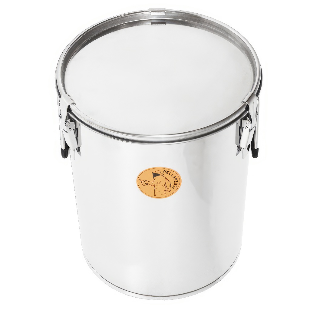 Tato nerezová nádoba slouží k uchovávání medu poté, co ho vytočíte z rámků. Jednoduše řečeno, je to pevná a odolná „plechovka" z kvalitní nerezové oceli, do které se vejde přibližně 35 kg medu. Má víko s gumovým (silikonovým) těsněním, které med chrání před prachem, vlhkostí a nečistotami. Víko se navíc připevňuje kovovými háčky, takže se nemůže samovolně otevřít, ani když nádobu přenášíte. Po stranách najdete dvě pevná úchytka, díky kterým se s nádobou dobře manipuluje.