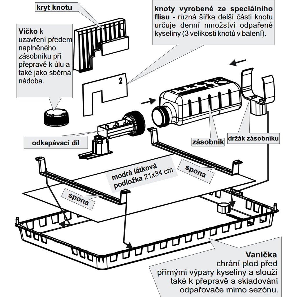 Odpařovač pracuje na principu kapilárního vzlínání. Tekutina je pomocí knotu dopravována ze zásobníku na odpařovací plochu, odkud se kontrolovaně uvolňuje do úlového vzduchu. Stabilní odpar pomáhá udržet vyrovnanou koncentraci výparů, přičemž intenzitu můžete přizpůsobit volbou velikosti knotu.