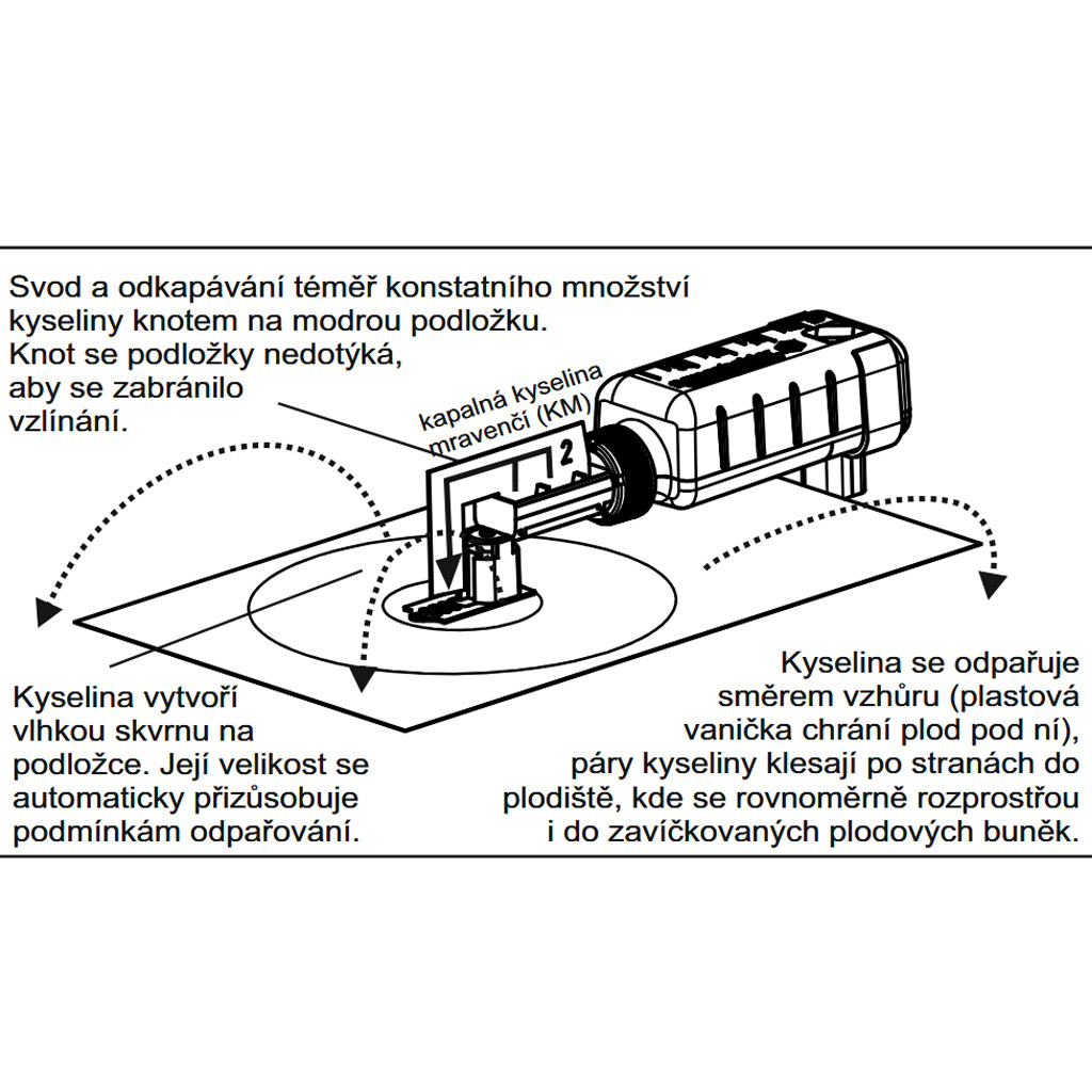 Snadné umístění do úlu: Odpařovač není nutné vkládat do rámků ani zasahovat do včelího díla. Jednoduše se položí na horní loučky rámků – typicky v prázdném nástavku nebo v krmné komoře. Plodiště zůstává volné a včelstvo je méně rušeno.