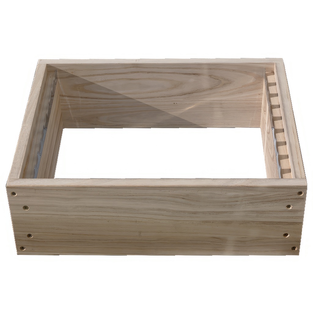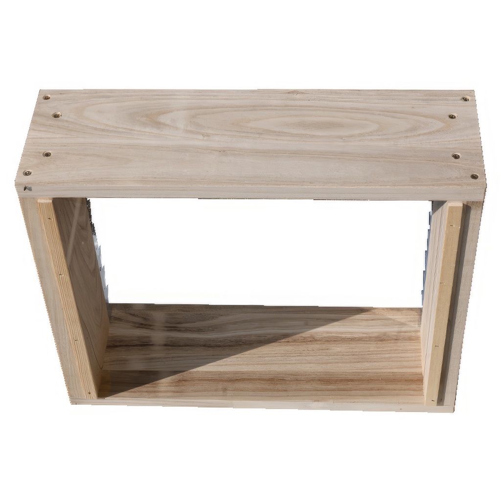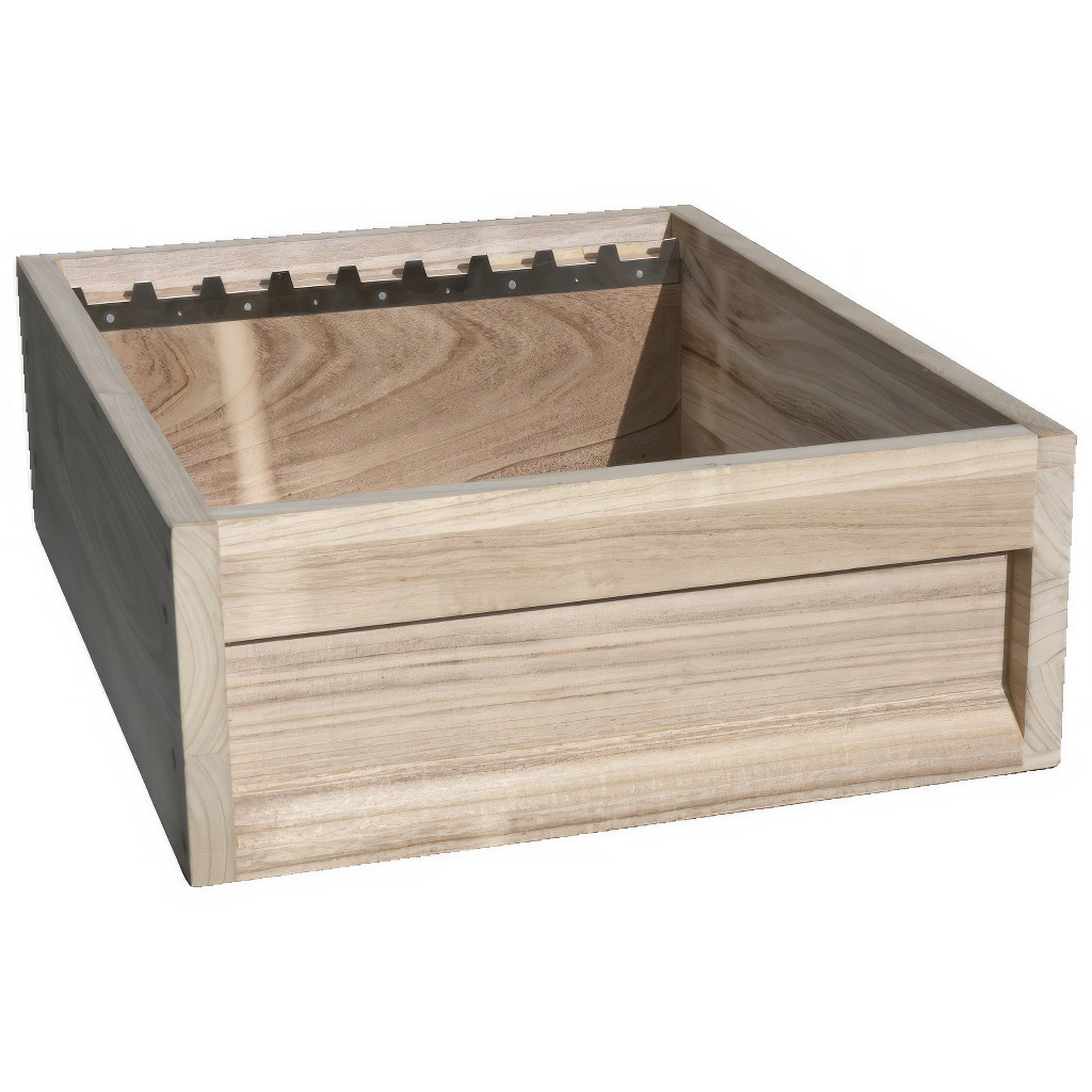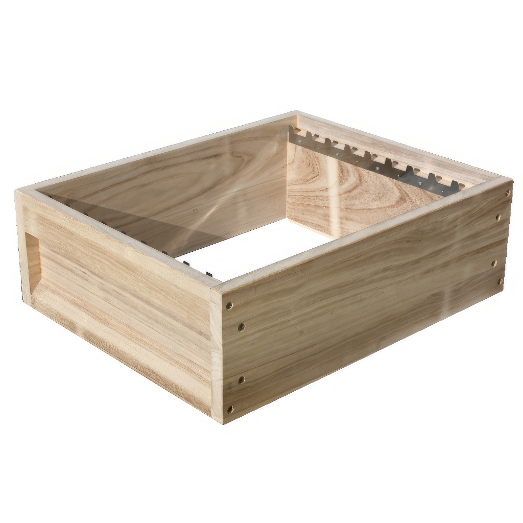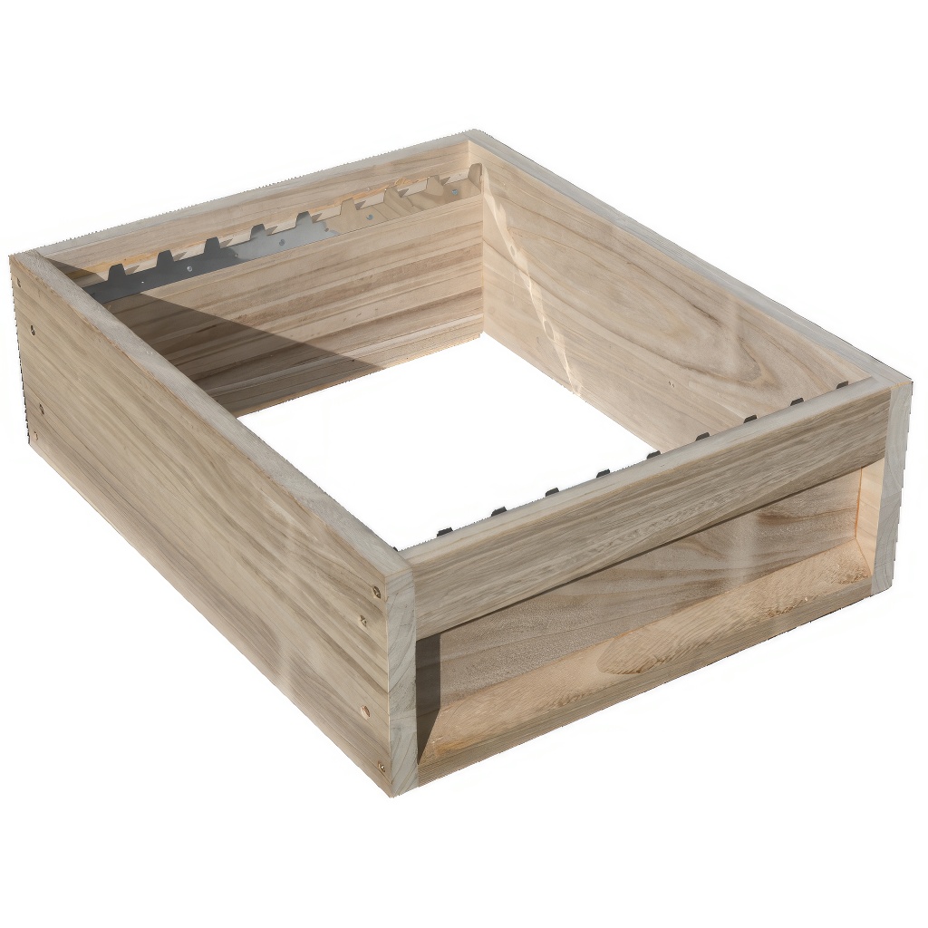 Tento nástavek si představte jako jednu „patrovou přihrádku" úlu, do které včely ukládají med. Je nižší než běžné nástavky, takže když ho budete sundávat plný medu, nebude tak těžký a lépe se s ním pracuje. Dovnitř se vejde 9 rámků – to jsou takové rámy, do kterých včely stavějí plásty a plní je medem. Na okrajích nástavku jsou přišroubované kovové lišty s vroubky (distanční hřebeny), které drží rámky pěkně od sebe v pravidelných rozestupech. Díky tomu nemusíte nic měřit ani nastavovat – prostě rámky zasunete do vroubků a máte hotovo. Materiál těchto lišt je nerezová ocel, takže nerezaví a vydrží vám dlouhé roky. Tento nástavek patří do systému Zander, což je jeden z nejrozšířenějších typů úlů v Evropě.