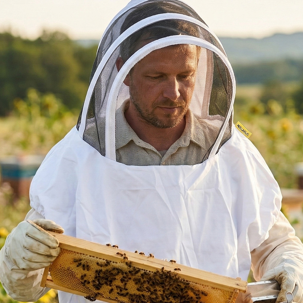 Kukla Mellarius s bavlněným plátnem poskytuje standardní ochranu hlavové partie při prohlídkách včelstev. Černá síťovina minimalizuje odlesky a zlepšuje vizuální kontakt s plástem. Široký kšilt udržuje dostatečný odstup síťky od pokožky, čímž eliminuje riziko bodnutí přes materiál. Bavlna zajišťuje prodyšnost a odolává opakovanému praní. Vhodná pro běžné provozní prohlídky i medobraní.