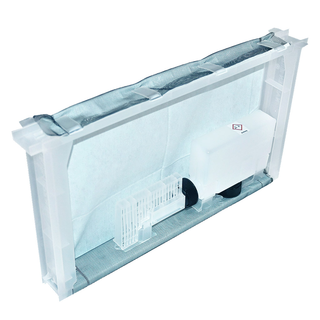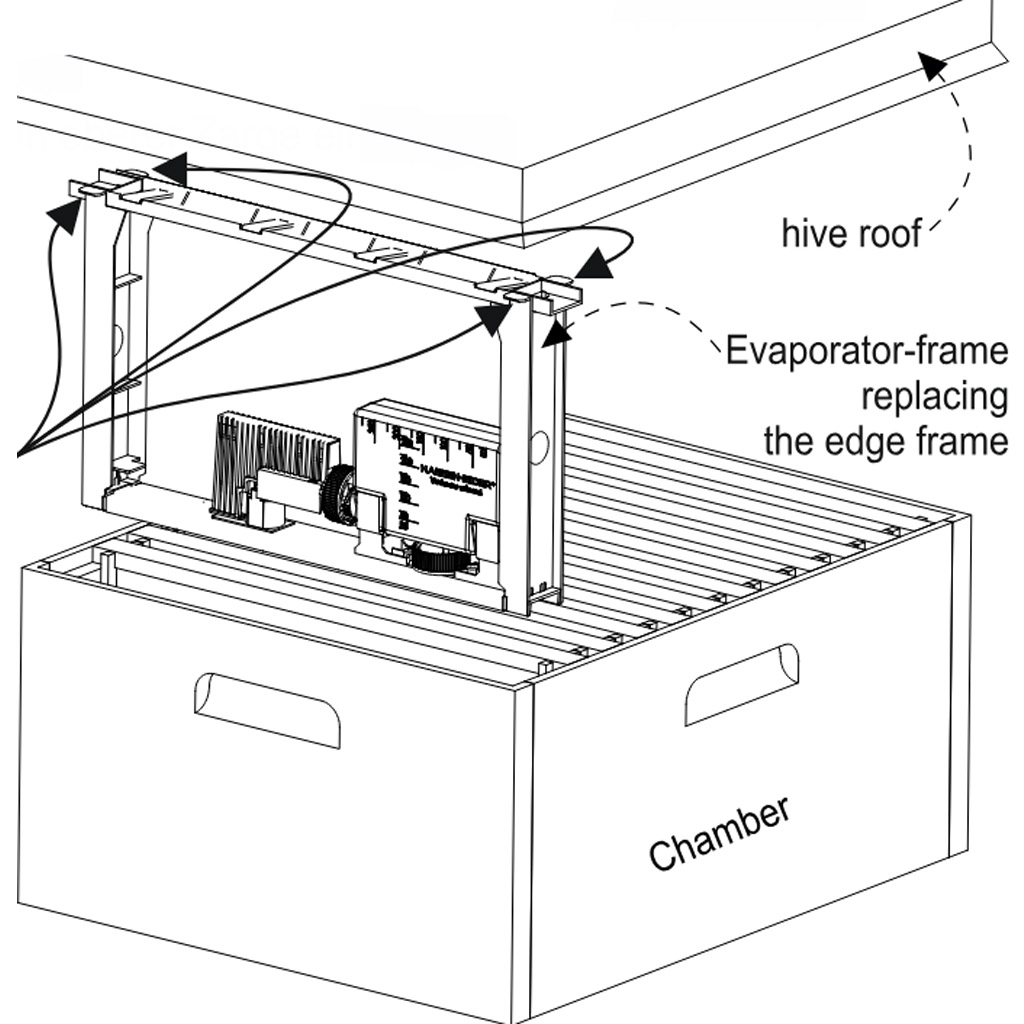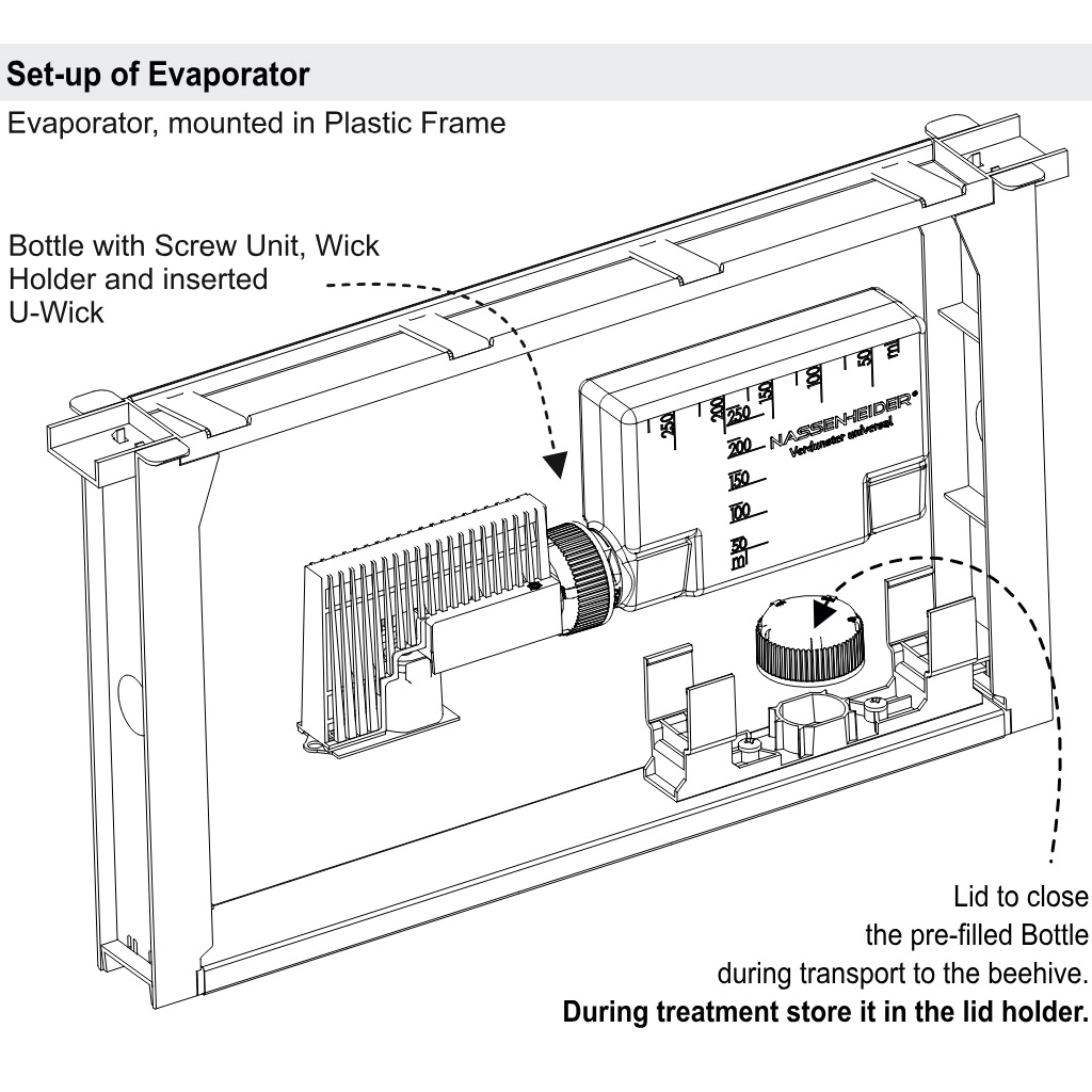 Nádoba odpařovače je tvořena uzavíratelnou lahví se stupnicí pro jednoduché a bezpečné plnění. Lahvička pojme 300 ml, což zajišťuje dostatek tekutiny i pro velké včelí kolonie bez nutnosti častého doplňování. Celá jednotka se snadno instaluje pomocí dvou šroubů do rámku a samotné zařízení lze pohodlně zavěsit na boční stěnu úlu.