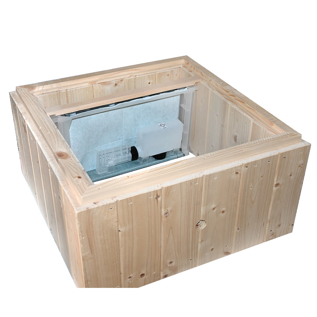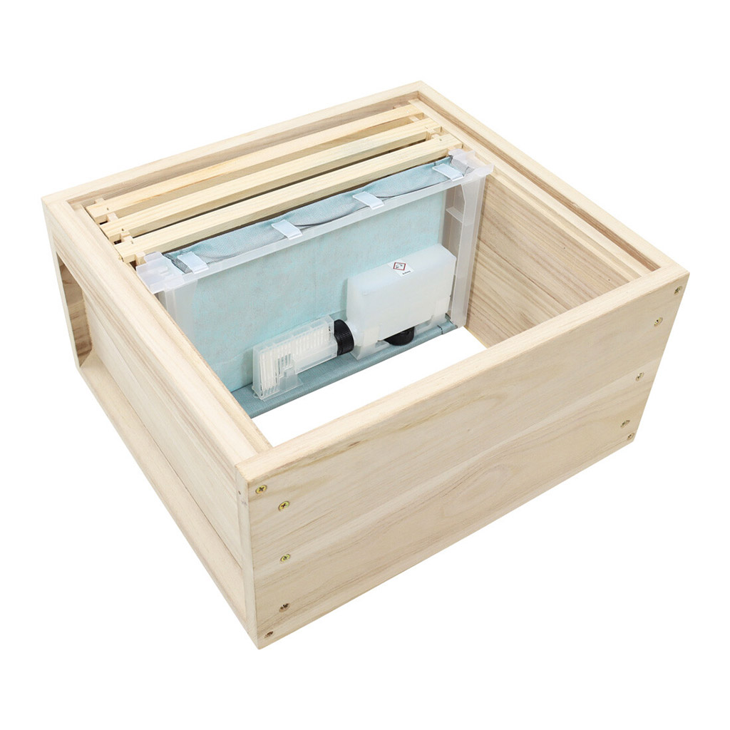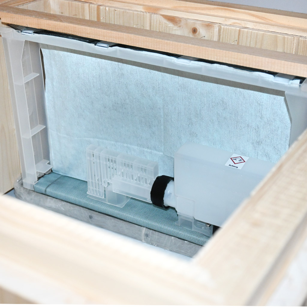 Nádoba odpařovače je tvořena uzavíratelnou lahví se stupnicí pro jednoduché a bezpečné plnění. Lahvička pojme 300 ml, což zajišťuje dostatek tekutiny i pro velké včelí kolonie bez nutnosti častého doplňování. Celá jednotka se snadno instaluje pomocí dvou šroubů do rámku a samotné zařízení lze pohodlně zavěsit na boční stěnu úlu.