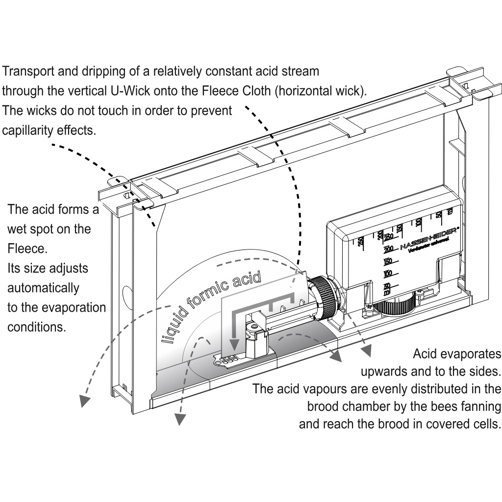 Unikátní technologie odpařování umožňuje téměř konstantní a řízený objem odparu po celou dobu aplikace, která trvá minimálně 10- 14 dní. Během této doby dochází k plynulému působení, což významně omezuje možnost poškození včelí matky a zajišťuje bezpečnost včelstva.