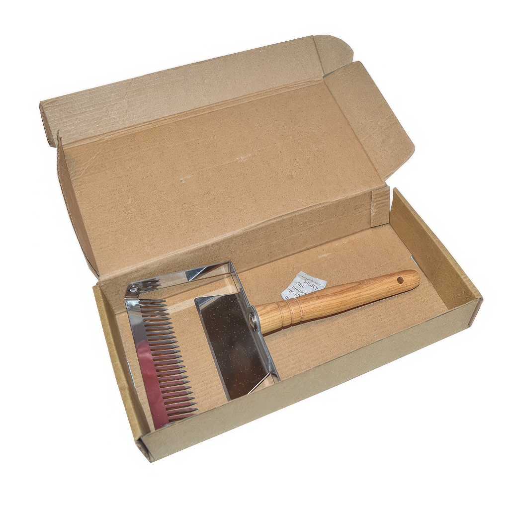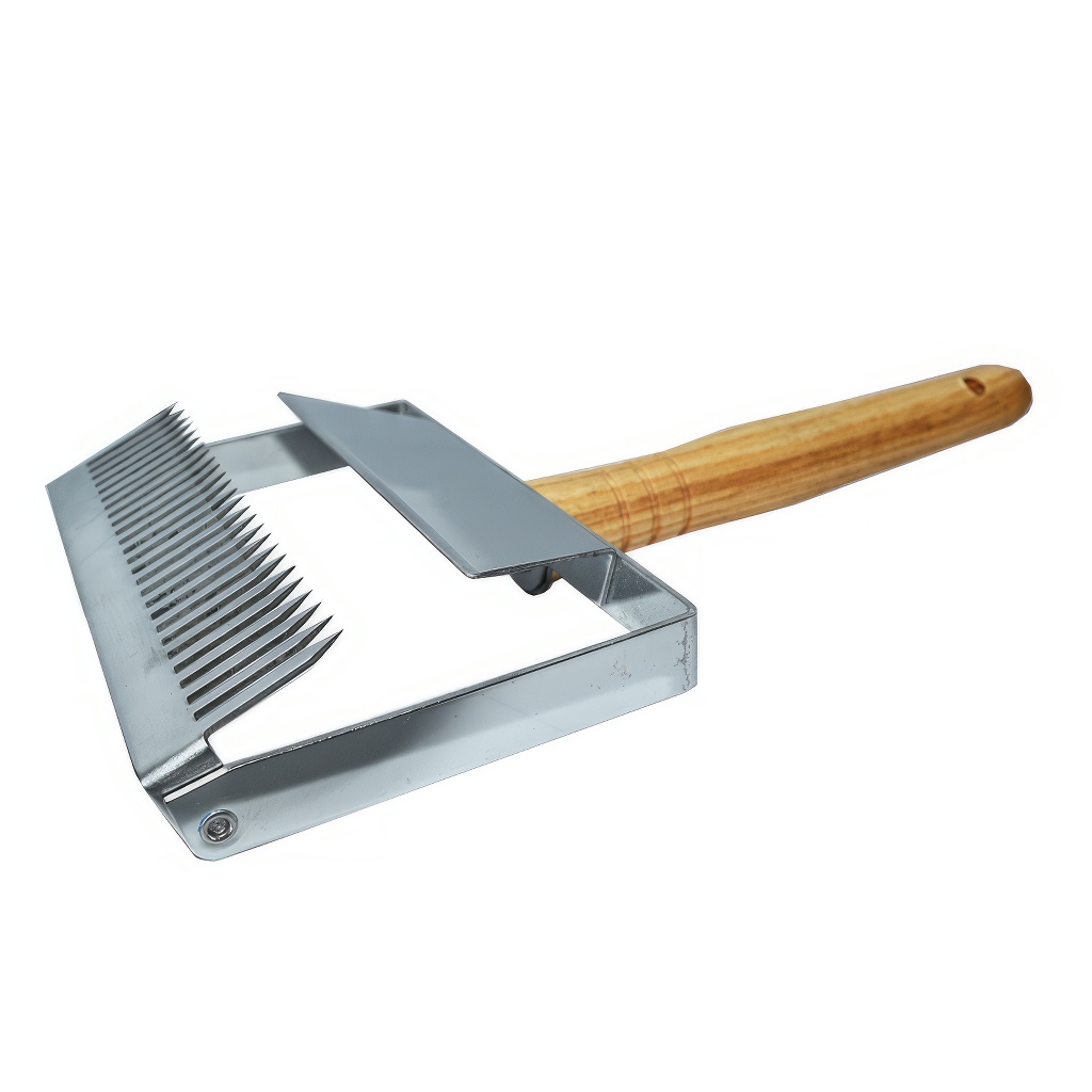 Než med z plástů vytočíte, musíte nejdřív odstranit tenké voskové kryty, kterými včely jednotlivé buňky s medem uzavřely. A přesně k tomu slouží tato vidlička. Vypadá trochu jako hřeben s dlouhými kovovými hroty. Vidličkou jednoduše podjedete pod tyto voskové kryty a odstraníte je, čímž se med v buňkách odkryje a může při točení volně vytékat.