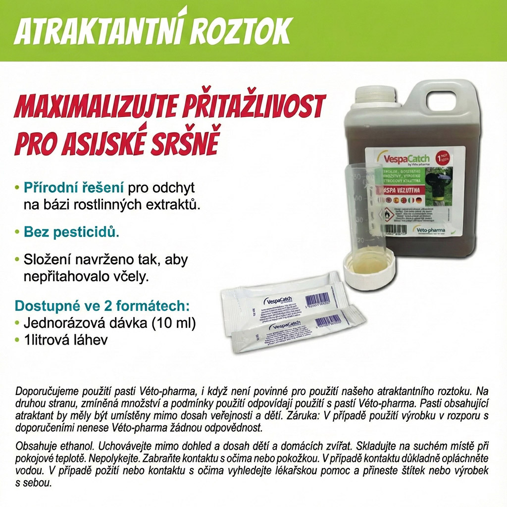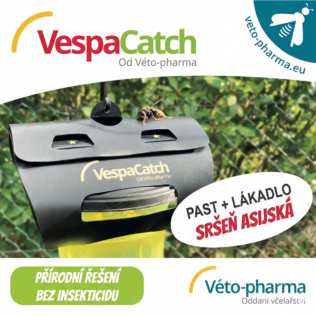 VespaCatch je účinné, přirozené a bezpečné řešení pro odchyt invazivní sršně asijské (Vespa velutina). Past vyvinutá laboratoří Véto-Pharma pomáhá chránit včelstva, zahrady i vinice a díky promyšlené konstrukci má vysokou selektivitu (omezuje dopad na ostatní hmyz).
