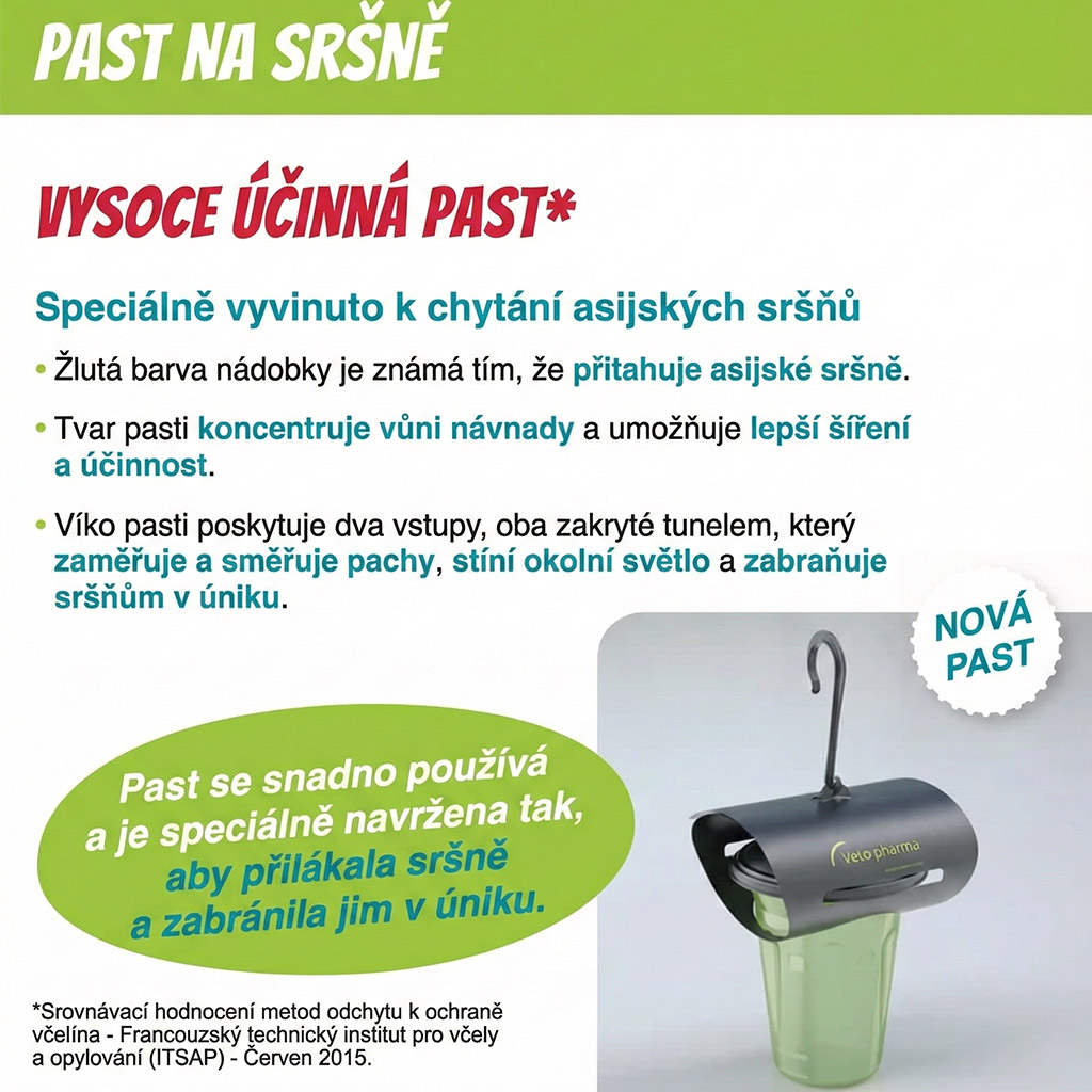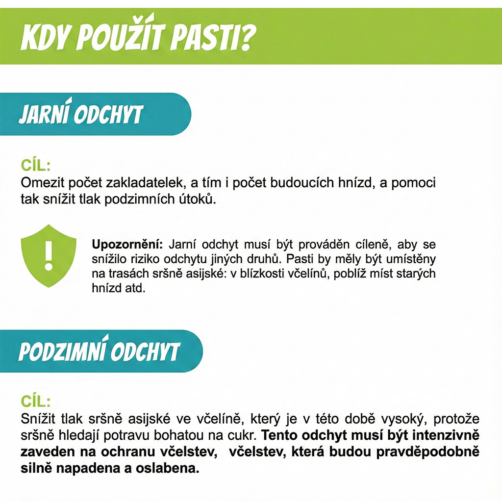 Past s vysokou selektivitou určená k ochraně včelstev před predací Vespa velutina. Kónická konstrukce s tunelovým víkem zajišťuje koncentraci těkavých látek atraktantu a směruje je do okolí letových koridorů. Nasazení na jaře cílí na odchyt zakladatelek před založením nových hnízd, podzimní použití snižuje predační tlak dělnic v období kritického zásobování včelstev. Při výměně návnady se doporučuje ponechat rezidua předchozího roztoku i případný kadáver sršně – uvolňované kairomony urychlují nalákání dalších jedinců. Účinnost ověřena testy ITSAP.