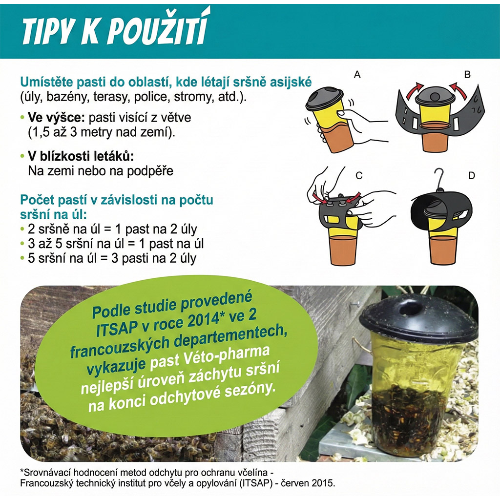 - Jak účinná je past VespaCatch ve srovnání s jinými pastmi?Ve srovnávacích testech v Portugalsku a při zkouškách francouzského institutu ITSAP odchytila past VespaCatch 2,3× více sršní asijských než past Tap-trap® a 5,7× více sršní asijských než běžné domácí pasti.