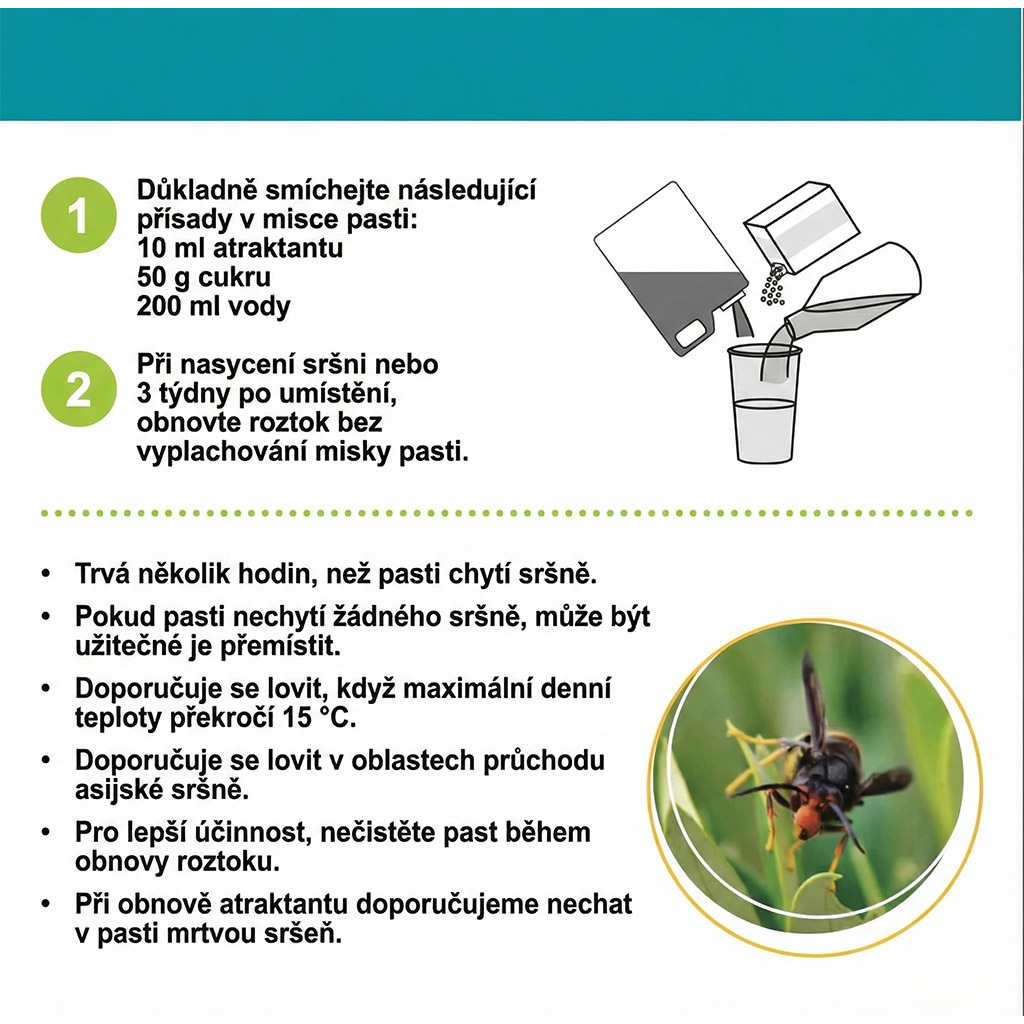 | Ředění atraktantu | 10 ml atraktantu + 200 ml vody + 50 g cukru |