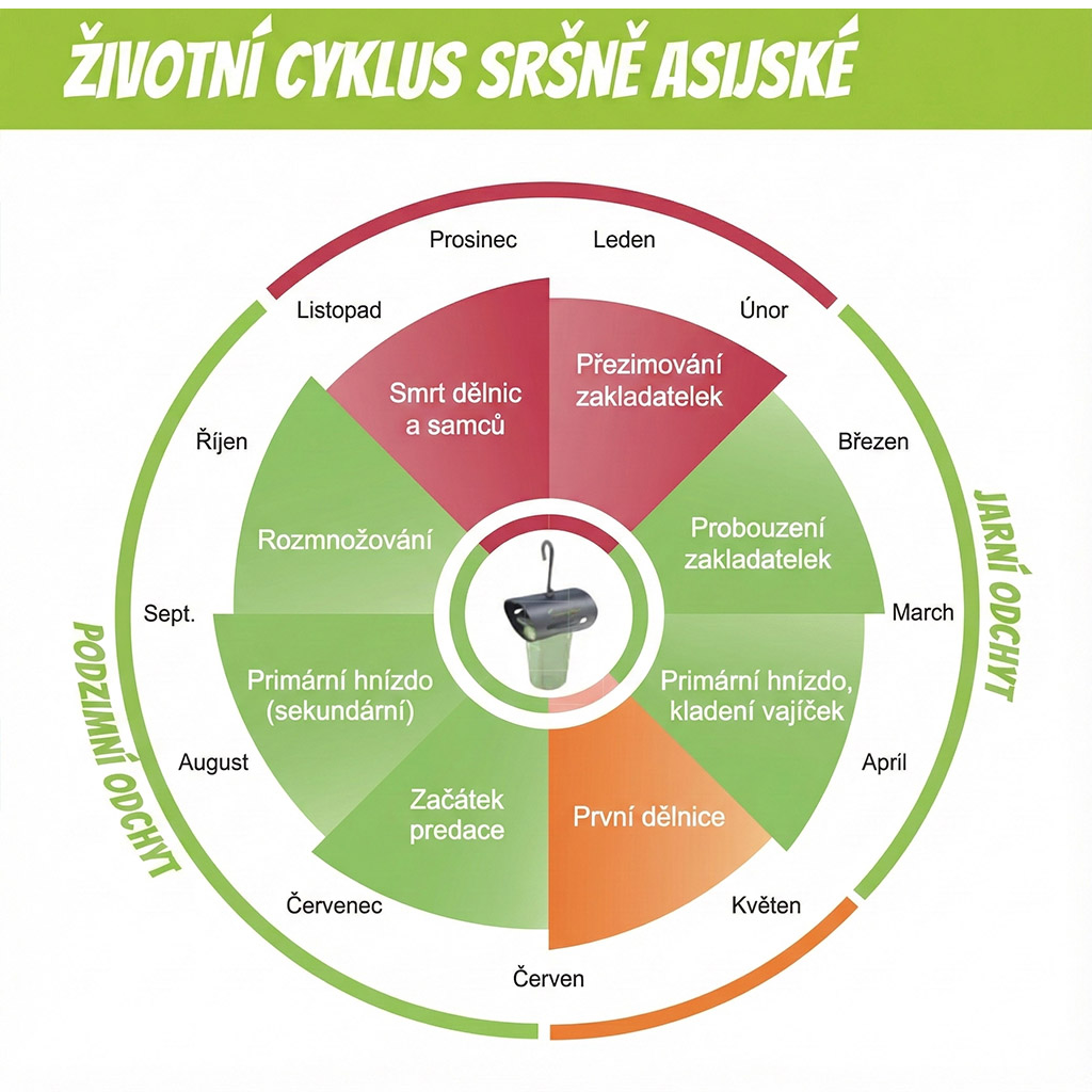Návnadu v pasti je potřeba vyměnit přibližně jednou za tři týdny. Malá rada: když budete past čistit, nechte ji trochu „ušpiněnou" od staré návnady – ten zbytek zápachu pomáhá přilákat další sršně rychleji. Začít chytat můžete na jaře, jakmile se oteplí nad 15 stupňů – v tu dobu totiž létají královny, které zakládají nová hnízda, a každá chycená královna znamená o jedno hnízdo méně. Na podzim pak past pomáhá chránit včelstva v době, kdy je tlak sršní největší.