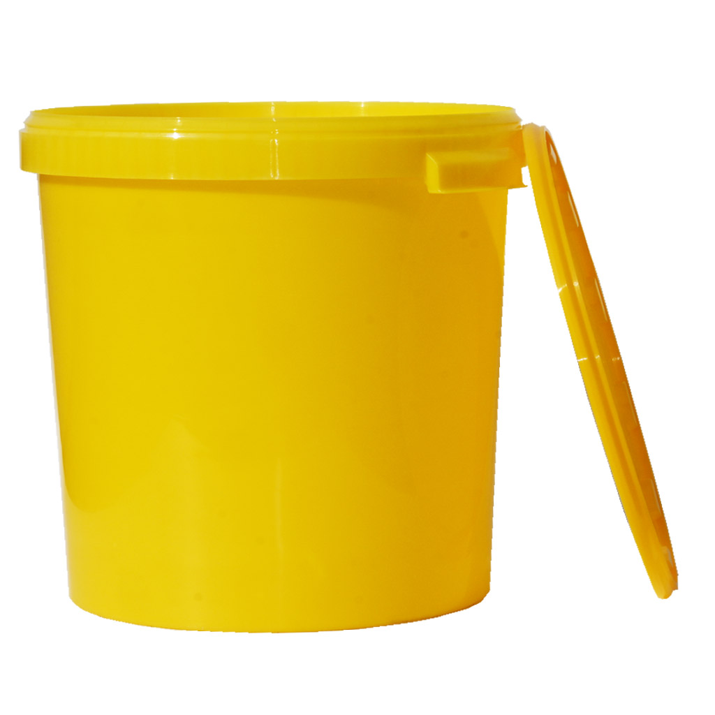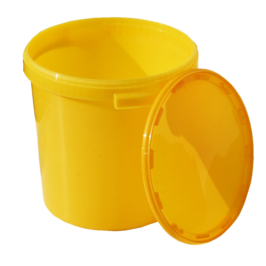 Potravinářský kbelík 33 l z panenského PP bez ručky. Vhodný pro skladování a přepravu medu, cukerného sirupu, vosku i pastovitých hmot. Plombovatelné víko zamezí kontaminaci obsahu. Chemicky odolný materiál umožňuje použití i pro kyselinu mravenčí, kyselinu šťavelovou a další látky používané při ošetřování včelstev proti varroáze. Bez ručky, stohovatelný, snadno omyvatelný. Objem 31,5 l užitný (ISO) pojme cca 45 kg medu při průměrné hustotě 1,42 g/ml.