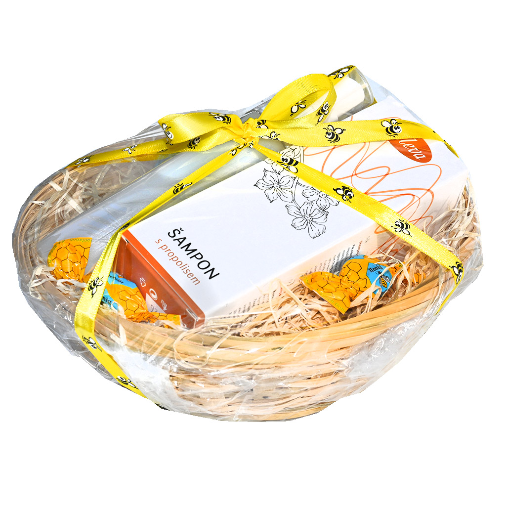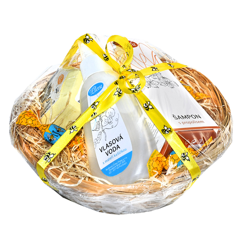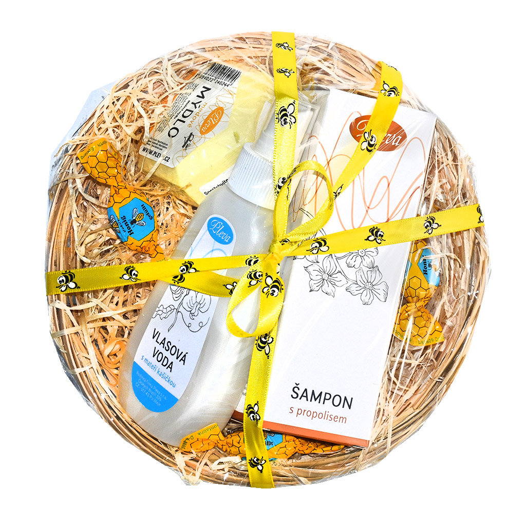 | Obsah košíku | Vlasová voda s mateří kašičkou, Medový šampon s propolisem, Medové mýdlo |