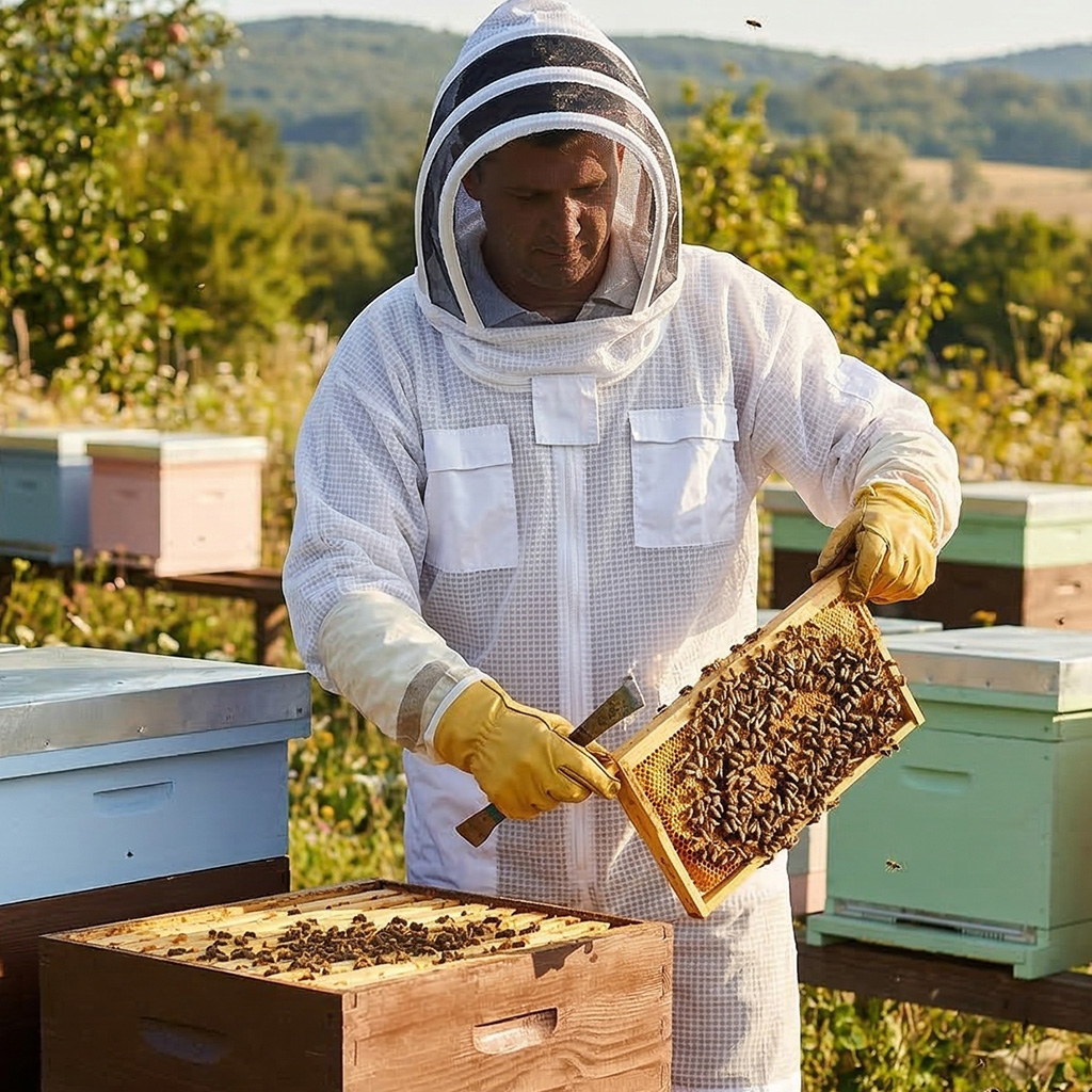 Tato celotělová včelařská kombinéza ve stylu „kosmonaut“ s integrovanou kuklou je navržena pro klidnou a bezpečnou práci u úlů. Ocení ji začínající včelaři i ti zkušení – spolehlivě chrání celé tělo před žihadly při běžných úkonech na včelnici. Pevná, tužší bavlněná tkanina odolává propíchnutí a světlá barva včely zbytečně nedráždí, takže přispívá k poklidnějšímu průběhu prohlídek včelstev. S touto kombinézou se můžete soustředit na práci i u bodavějších včel.