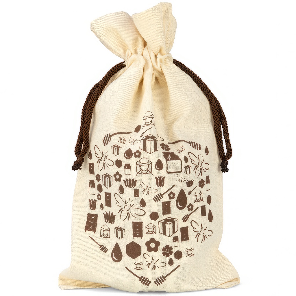 Hledáte elegantní způsob, jak darovat med? Nebělený bavlněný pytlík s motivem "Hexagon" promění každou sklenici medu v krásný dárek. Stačí vložit sklenici, zatáhnout šňůrku a máte hotovo. Vejde se do něj jedna velká sklenice (1000 g) nebo dvě menší (500 g), takže máte flexibilitu při výběru dárku. Přírodní bavlna bez bělení podtrhuje řemeslný charakter včelích produktů a pytlík lze po použití jednoduše vyprat a využít znovu.