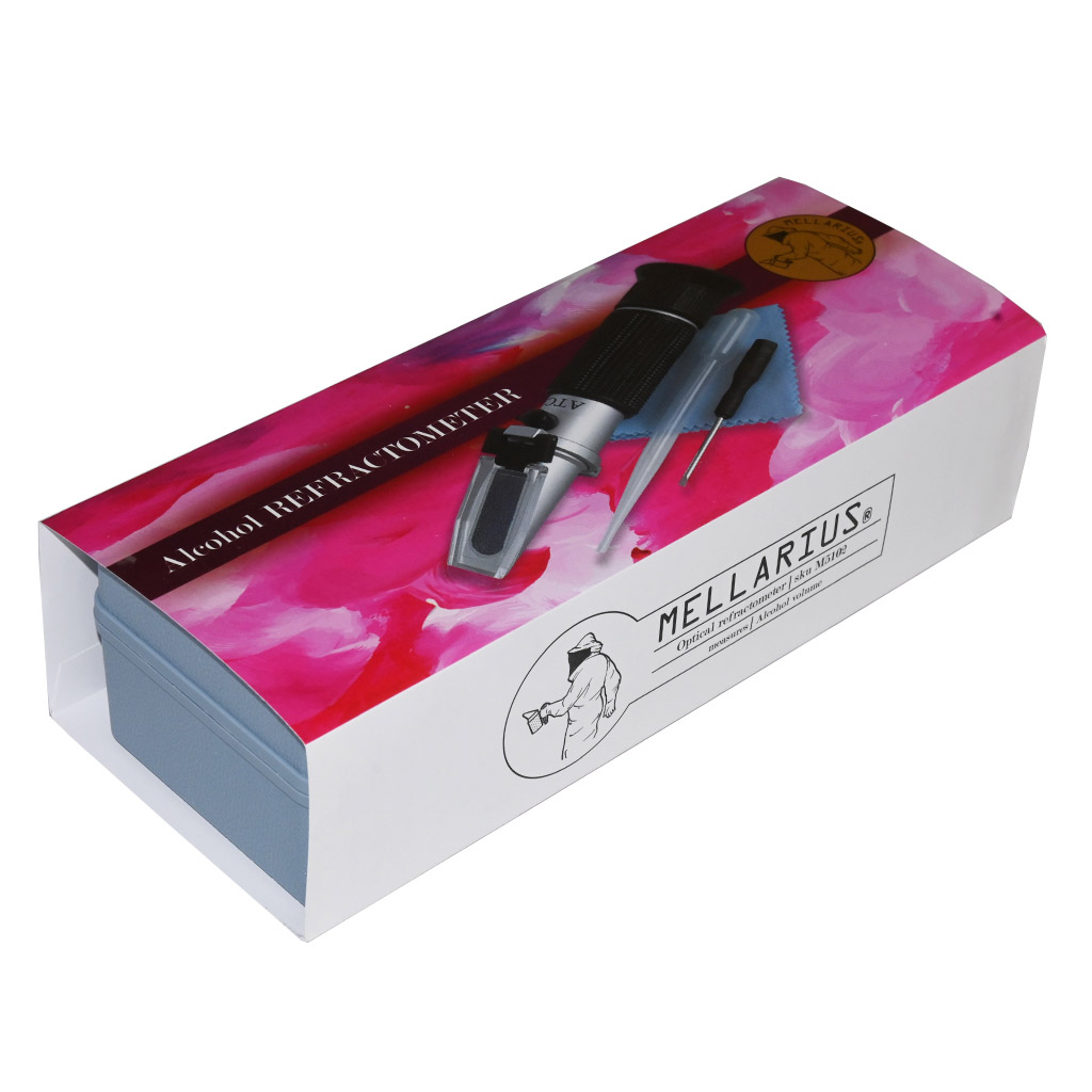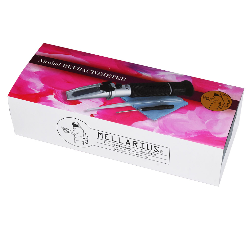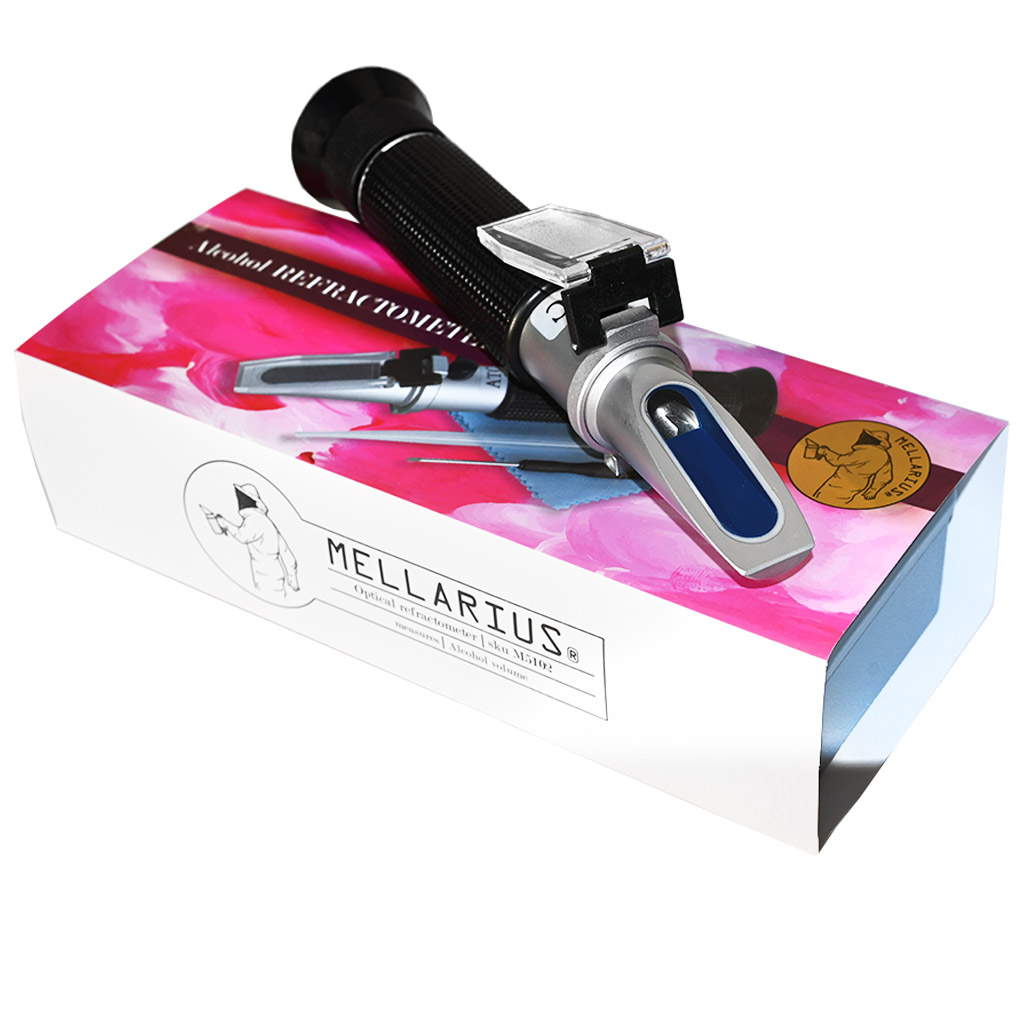 Optický refraktometr určený ke stanovení cukernatosti medného roztoku (stupnice Brix) a odhadu potenciálního obsahu alkoholu (stupnice % vol.) před zakvašením. Stupnice Brix vyjadřuje hmotnostní koncentraci sacharózy – 1 °Bx odpovídá 1 g cukru ve 100 g roztoku. Hodnota na stupnici % vol. udává předpokládaný obsah ethanolu za předpokladu úplného prokvašení dostupných cukrů. Integrovaná automatická teplotní kompenzace (ATC) eliminuje nutnost manuálních korekcí v rozsahu 0–30 °C při referenční teplotě 20 °C. Přesnost ± 0,2 % umožňuje dostatečně spolehlivé řízení kvašení a opakovatelnost při přípravě jednotlivých várek. Měření probíhá refraktometricky na principu lomu světla na rozhraní hranol–vzorek. Po každém měření je nutné hranol a krycí destičku otřít vlhkým hadříkem. Přístroj neponořovat do vody. Kalibrace se provádí destilovanou vodou pomocí přiloženého šroubováku.