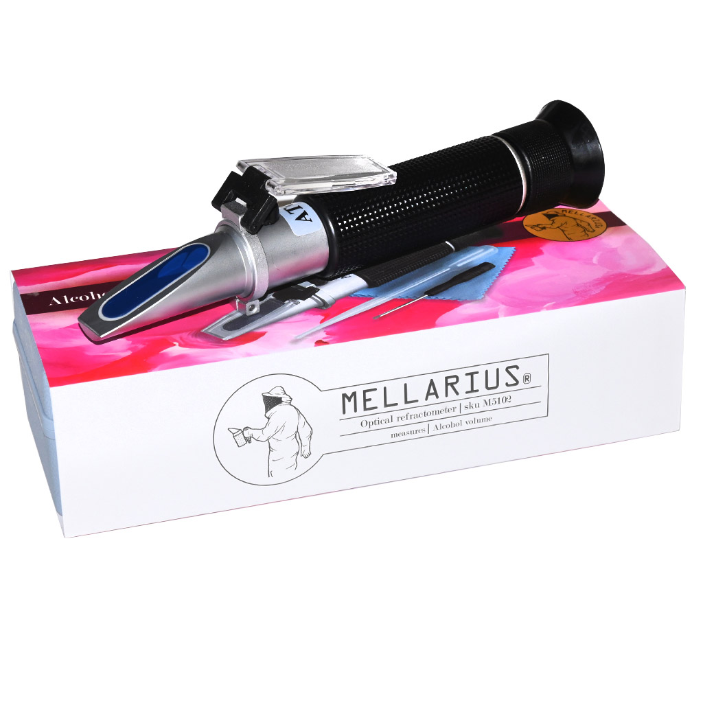 - Měří refraktometr obsah alkoholu přímo v hotové medovině?Ne. Stupnice 0–25 % vol. ukazuje předpokládaný (potenciální) obsah alkoholu na základě cukernatosti roztoku před kvašením. Nejde tedy o přímé měření skutečného alkoholu v již prokvašeném nápoji. Pro přesné stanovení obsahu alkoholu v hotové medovině by bylo zapotřebí jiná metoda, například destilační.