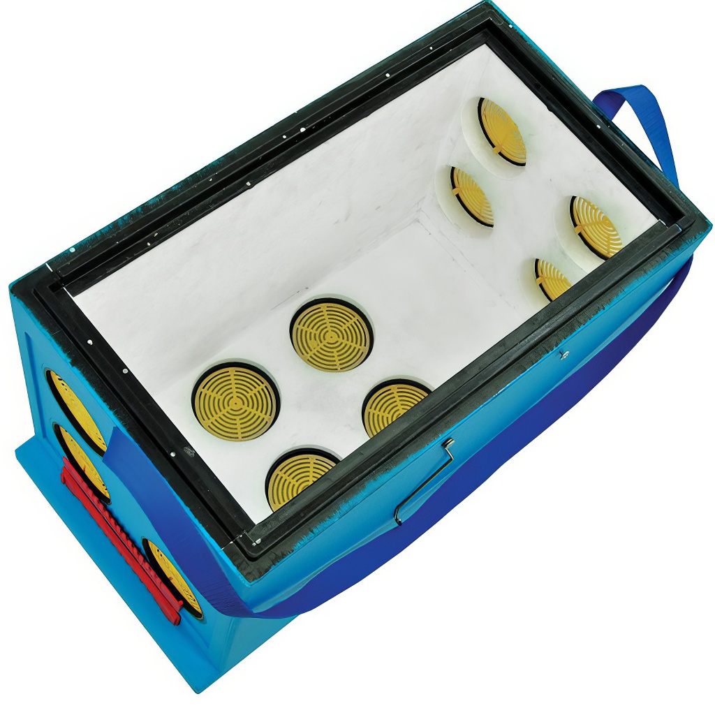 Představte si tento box jako přenosnou krabici, do které můžete vložit až 6 rámků z úlu. Používá se hlavně ve chvíli, kdy potřebujete rámky se včelami bezpečně přenést z jednoho místa na druhé, například když chcete rozdělit silné včelstvo na dvě části nebo když chytáte roj, který se usadil někde na stromě. Box je vyrobený z polystyrenu, takže je velmi lehký a snadno se s ním manipuluje. Zároveň polystyren dobře drží teplo, což je pro včely důležité, protože se při přenášení neprochladí. Rámky do něj přesně zapadnou, takže se během přepravy nebudou pohybovat a včelám se nic nestane. Zkrátka je to jednoduchá a praktická pomůcka, kterou ocení každý včelař, ať už na včelíně pracuje pravidelně, nebo teprve začíná.