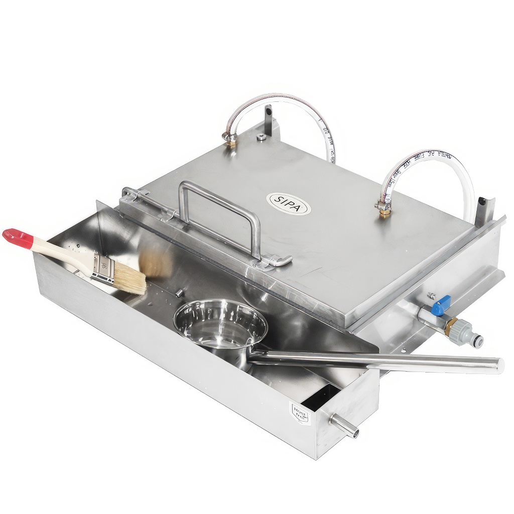 Lis má pevnou a stabilní konstrukci z broušené nerezové oceli, která se snadno čistí a je odolná při dlouhodobém provozu. Horní víko je vybaveno robustním madlem pro pohodlné otevírání a bezpečný přítlak. Pracovní část tvoří dvě přesné embosovací plochy z modrého silikonu o rozměru 395 × 195 mm (vhodné např. pro míru Zander a další kompatibilní rámky). Na boku je vstup chladicí vody s kulovým ventilem a rychlospojkou pro snadné připojení běžné zahradní hadice. V přední části se nachází záchytná vana na přebytečný vosk (dle provedení odnímatelná nebo integrovaná). Pro přesné dávkování roztaveného vosku na matrici je v balení přiložena nerezová naběračka.