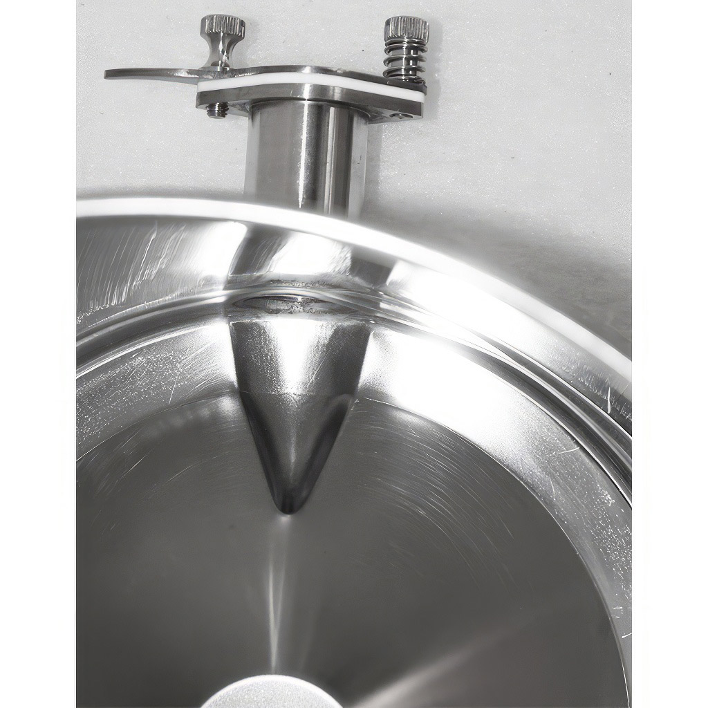 Nerezová čeřící nádoba s dvoukohoutkovou konstrukcí určená pro gravitační čeření medu. Horní kohout slouží k plnění přes kónické síto, spodní k odpouštění vyčeřeného medu ze spodní části vyspádovaného dna. Integrovaná topná podložka umožňuje temperaci medu během stáčení a zabraňuje předčasné krystalizaci při plnění. Plazmově svařené spoje zajišťují hladký vnitřní povrch bez záhybů, což eliminuje usazování zbytků medu a usnadňuje sanitaci. Pro víceúrovňovou filtraci lze na nádobu vrstvit přídavná síta odstupňované hrubosti. Doporučeno doplnit nerezovým stojanem pro pohodlné odpouštění do skladovacích nádob či přímo do spotřebitelského balení.