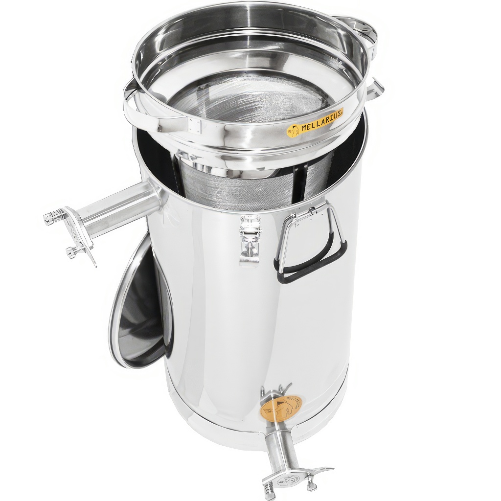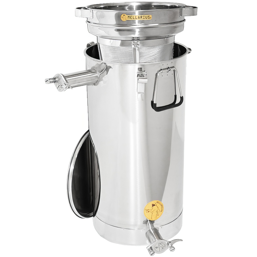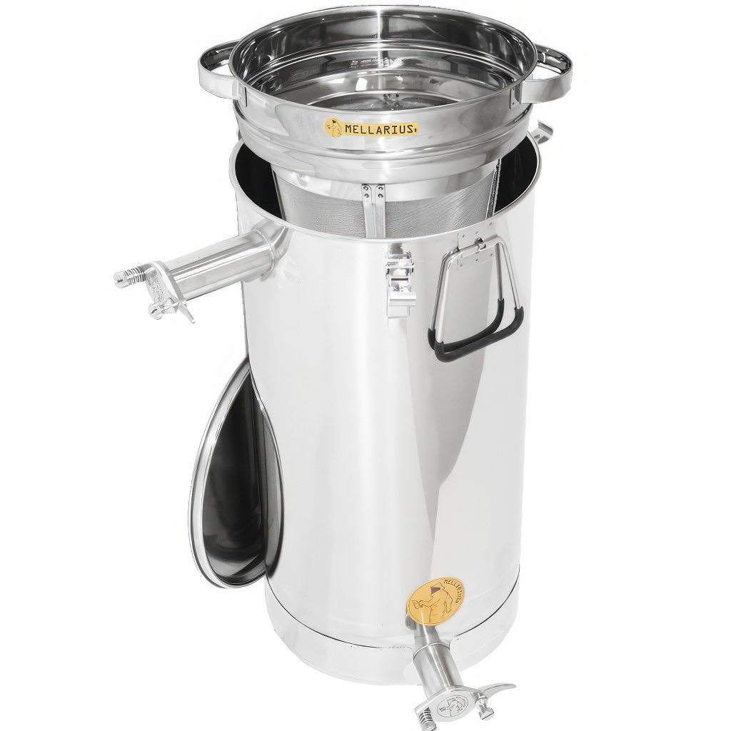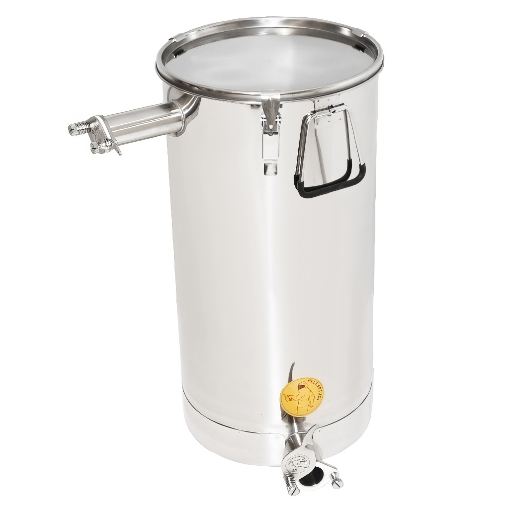 Nádoby na med Mellarius v několika variantách, v tomto případě s vyspádovaným dnem, těsnícím víkem a dvěma navařenámi nerezovými kohouty, které dovolují nádobu používat jako čeřící nádobu na med. Jsou vyráběny z kvalitní nerezové oceli, určené pro potravinářské účely o dostatečné síle (0,8 až 1 mm), tak aby nemohlo jednoduše docházet k nechtěným promáčklinám. Všechny části nádob jsou kvalitně svařeny za pomoci plazmového svařování. Při konstrukci je kladen důraz na hladné povrchy, které lze snadno čistit, proto jsou nádoby vyrobeny z leštěných nerezových plechů. Všechny naše nádoby jsou opatřeny nerezovými madly pro snadné přenášení. Součástí balení je také nerezové síto, které můžete vložit do nádoby a pomocí horního kohoutu ji využívat jako čeřící nádobu.