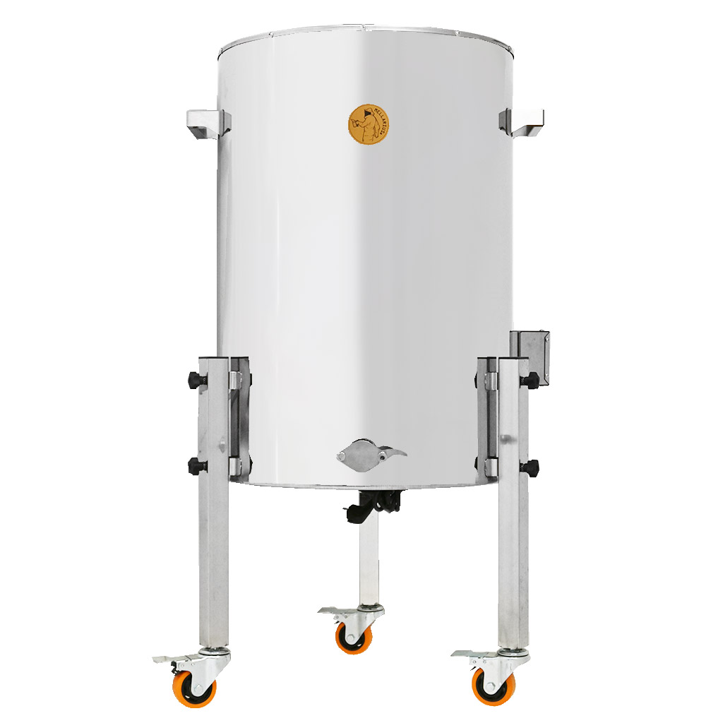 Nádoba pojme až 225 kg medu, což je opravdu velká dávka. Jakmile je med pěkně tekutý, jednoduše otevřete kohout ve spodní části nádoby a plníte přímo do sklenic. Nemusíte nic přelévat ani přenášet. Vše je vyrobeno z nerezové oceli, takže se nádoba snadno myje a vydrží vám dlouhé roky. Po stranách jsou velká madla, díky kterým se s nádobou dobře manipuluje.
