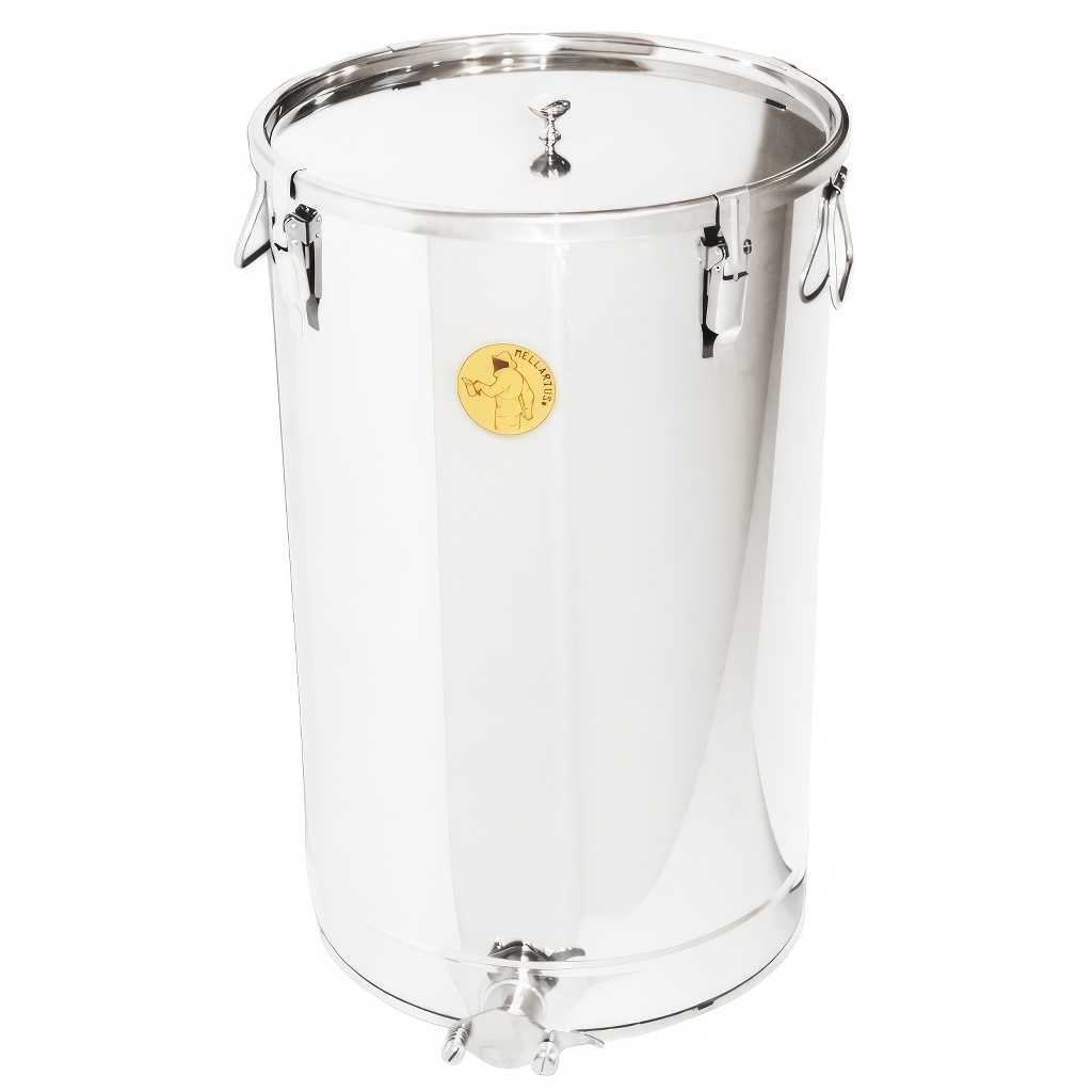 Stáčecí nádoba MaxiLine 100 kg s plazmově svařeným nerezovým kohoutem slouží ke stáčení a krátkodobému skladování medu. Těsnící poklice se silikonovým profilem a háčkovým zajištěním umožňuje bezpečnou manipulaci. Nádobu lze osadit stavitelnými síty pro hrubou i jemnou filtraci nebo kónickým sítem pro provoz jako čeřící nádoba. Na výpustný kohout je možné namontovat přesný vypouštěcí ventil pro dávkování do spotřebitelského balení.