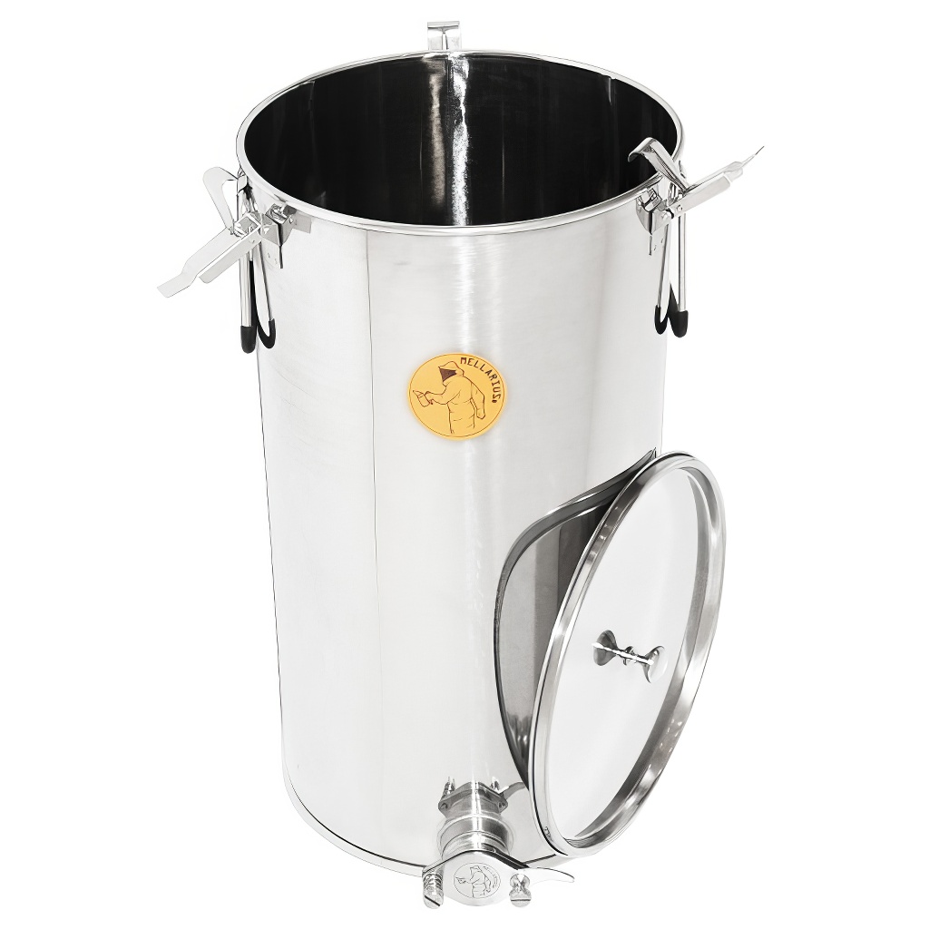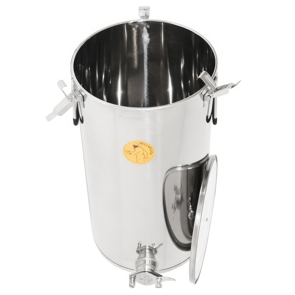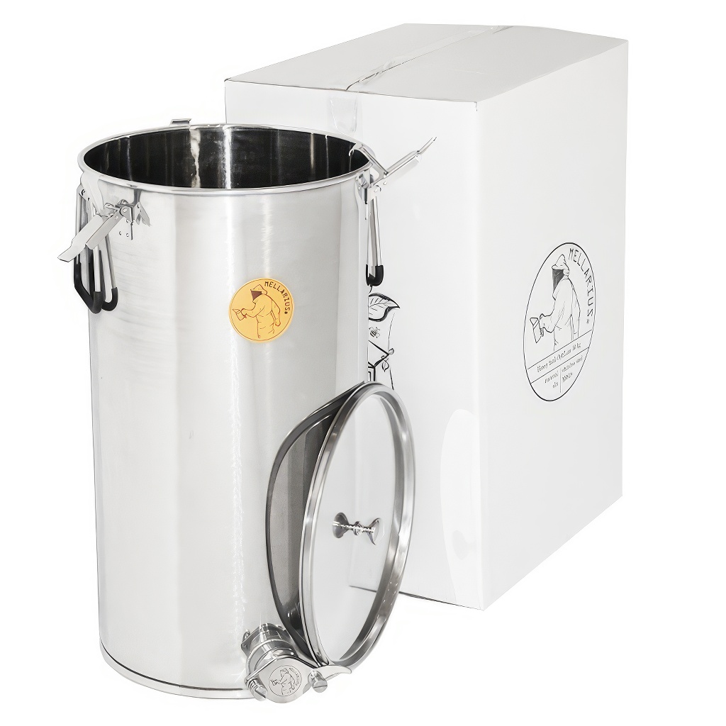 Nádoby na med Mellarius v několika variantách, v tomto případě s navařeným nerezovým kohoutem pro maximální pevnost. Jsou vyráběny z kvalitní nerezové oceli, určené pro potravinářské účely o dostatečné síle (0,8 až 1 mm), tak aby nemohlo jednoduše docházet k nechtěným promáčklinám. Všechny části nádob jsou kvalitně svařeny za pomoci plazmového svařování. Při konstrukci je kladen důraz na hladné povrchy, které lze snadno čistit, proto jsou nádoby vyrobeny z leštěných nerezových plechů. Všechny naše nádoby jsou opatřeny nerezovými madly pro snadné přenášení.