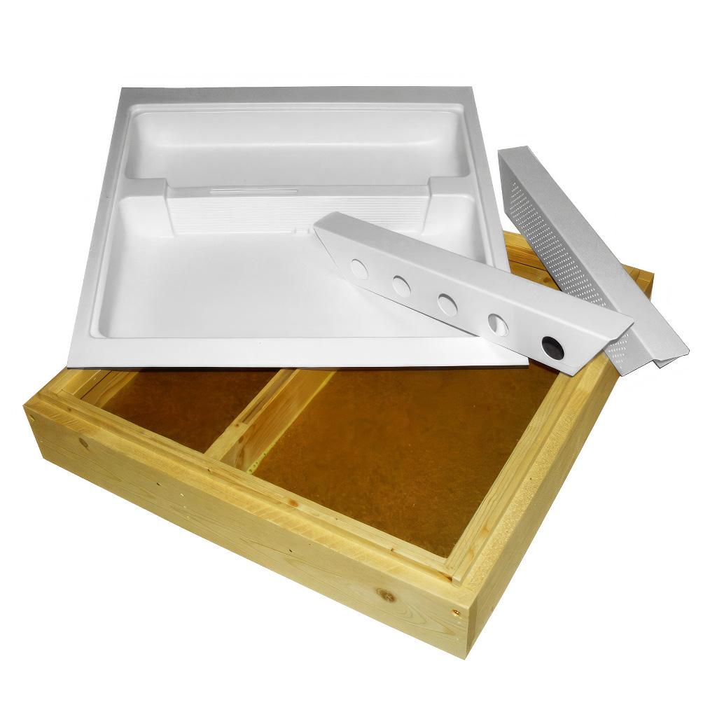 Krmítko tvoří robustní obvodový rám z masivního dřeva o tloušťce 25 mm (smrk nebo borovice vejmutovka). Uvnitř je vsazená plastová vanička z odolného materiálu (1,5–1,7 mm) se zesílenými rohy, která bez problémů zvládne plné zatížení cukerným roztokem. Spodní strana je zpevněna 3mm dřevovláknitou deskou, která současně slouží jako bezpečný prostor pro pohyb včel. Rohy rámu jsou lepené vodostálým lepidlem pro delší životnost při venkovním provozu.