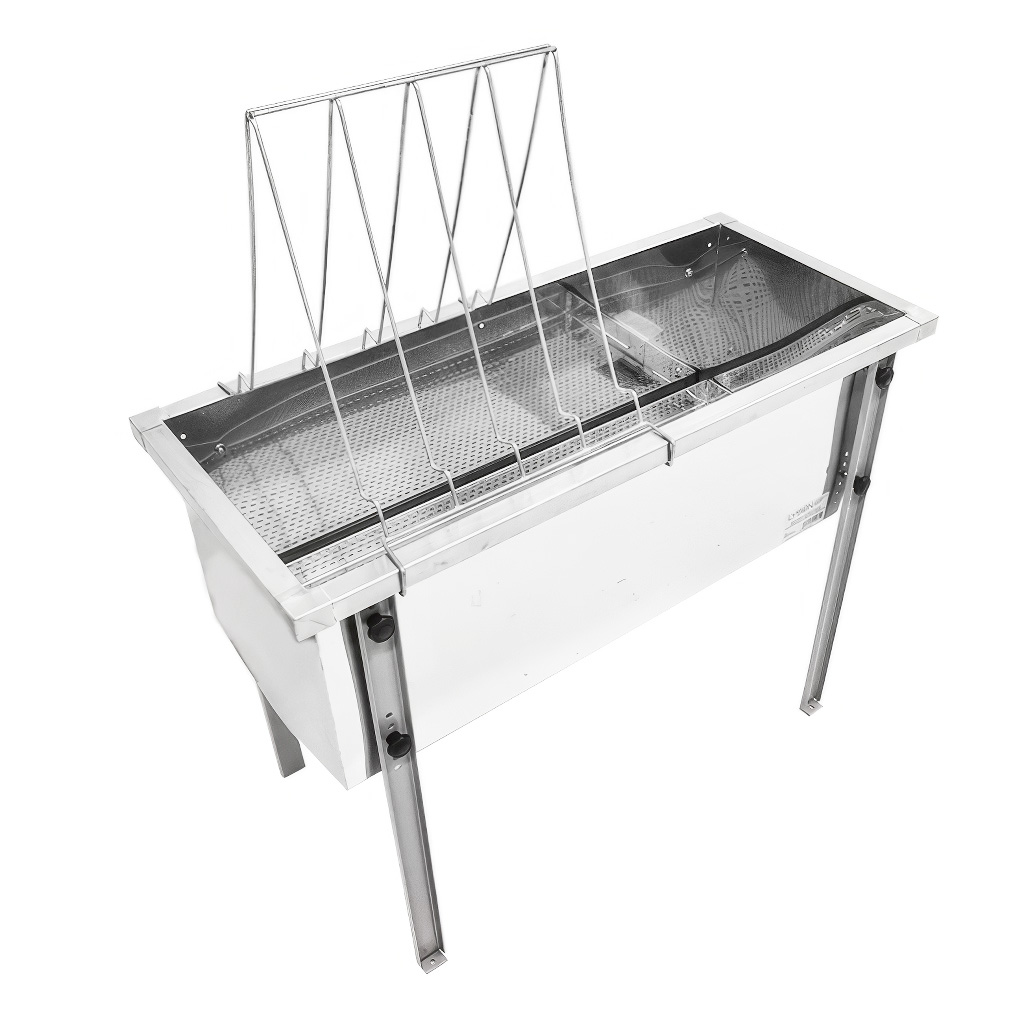 Spádované dno zajišťuje, že med samovolně stéká ke stáčecímu kohoutu a nezůstává v rozích vany. Vyjímatelné síto po celé délce spolehlivě odděluje odvíčka od medu, takže nemusíte nic přelévat ani dodatečně filtrovat. Nastavitelné nohy vám umožní přizpůsobit výšku stolu vaší postavě, což oceníte zejména při delším odvíčkování. Zesílená nerezová konstrukce zvládne i intenzivní sezónní nasazení a díky potravinářské oceli je údržba a čištění otázkou pár minut.