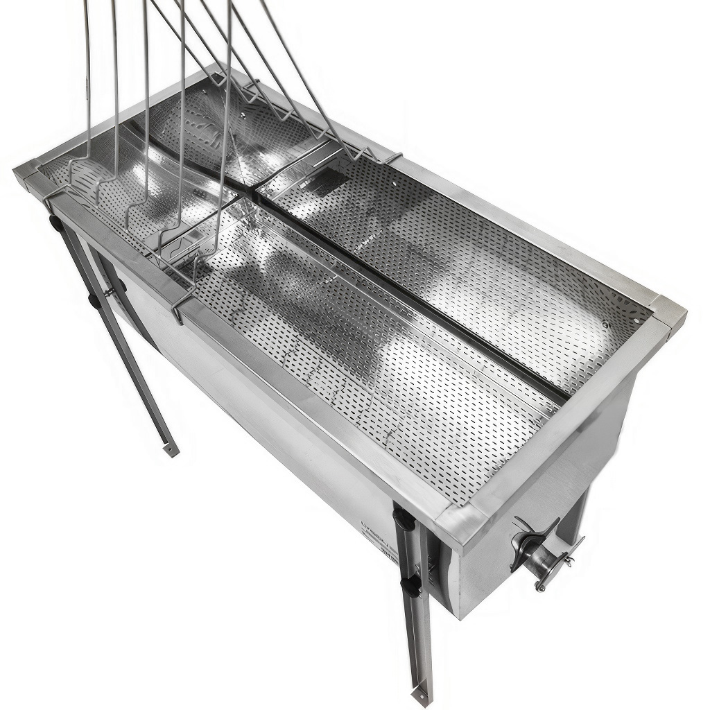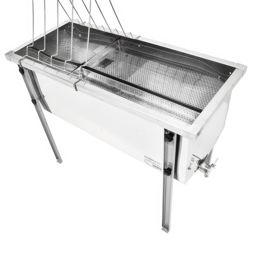 Vana má spádované (lichoběžníkové) dno, takže med přirozeně stéká směrem k nerezovému stáčecímu kohoutu a nezůstává zbytečně v zákoutích. Po celé délce je umístěno vyjímatelné perforované síto na odvíčka, které účinně odděluje vosk od medu. Protože síto pokrývá celé dno, můžete stojan pro rámky posouvat a nastavit si pracovní místo přesně podle potřeby.