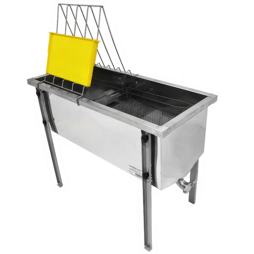 Nerezová odvíčkovací vana Lysoň Optima o délce 75 cm je určena pro provozní včelaření s větším počtem zatočených plástů. Umožňuje simultánní odvíčkování dvěma operátory z protilehlých stran. Integrované celoplošné nerezové síto zajišťuje separaci voskových víčků od stékajícího medu přímo ve vaně. Odvíčkované rámky lze před medobraním zavěsit na hrany vany. Vypouštění medu probíhá přes nerezový výpustný kohout ve spodní části. Kompatibilní se všemi běžnými rámkovými mírami.