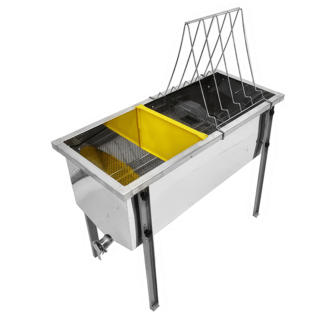 Dno vany je osazeno jemným celoplošným nerezovým sítem, které průběžně odděluje odvíčkovance (vosková víčka) od stékajícího medu. Med se shromažďuje ve spodní části a lze jej pohodlně stáčet do nádoby pomocí integrovaného nerezového kohoutu. Nerezová ocel je vhodná pro styk s potravinami, odolává mechanickému namáhání i běžným včelařským provozním podmínkám a zároveň se velmi snadno udržuje – po práci stačí omytí teplou vodou a úklid je rychlý.