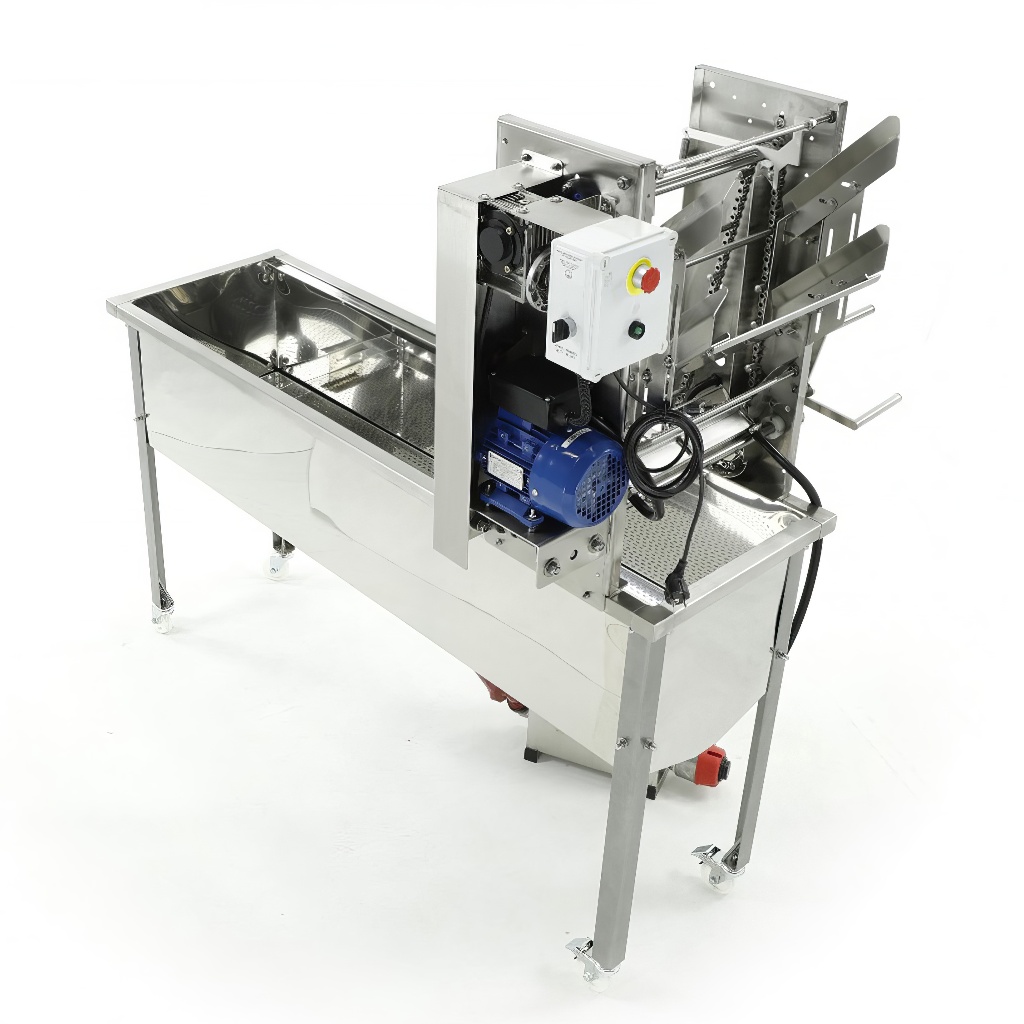 podávacími lištami, MINIMAOdvíčkovací stůl MINIMA s vyvíječem páry a podávacími lištami je zařízení na odvíčkování pláství před vytáčením medu. Je vysoce efektivní a účinné. Zařízení pracuje s vibračními noži, které odvíčkují rámky. Nové, zmodernizované nože umožňují důkladnější odvíčkování. Nože jsou vyhřívané prostřednictvím kapaliny, která se zahřívá a cirkuluje v uzavřeném okruhu. Zařízení je vybaveno podávacími lištami na rámky a podávačem, který automaticky posílá zavíčkované rámky k nožům.Sběrná nádoba je vyrobena z nerezové oceli, v dolní části je nerezový nožový výpustný ventil 6/4 ”. Uvnitř nádrže se nacházejí dva nerezové cedníky. Ocelové nohy jsou lakované práškovou barvou a jsou na kolečkách, což zjednodušuje přesun zařízení.Uzavřený okruh se skládá z nerezové nádrže s ohřívačem, spojovacích hadic (připojených k nožům) a ovládací skříňky.