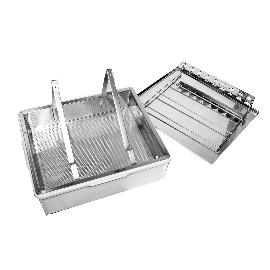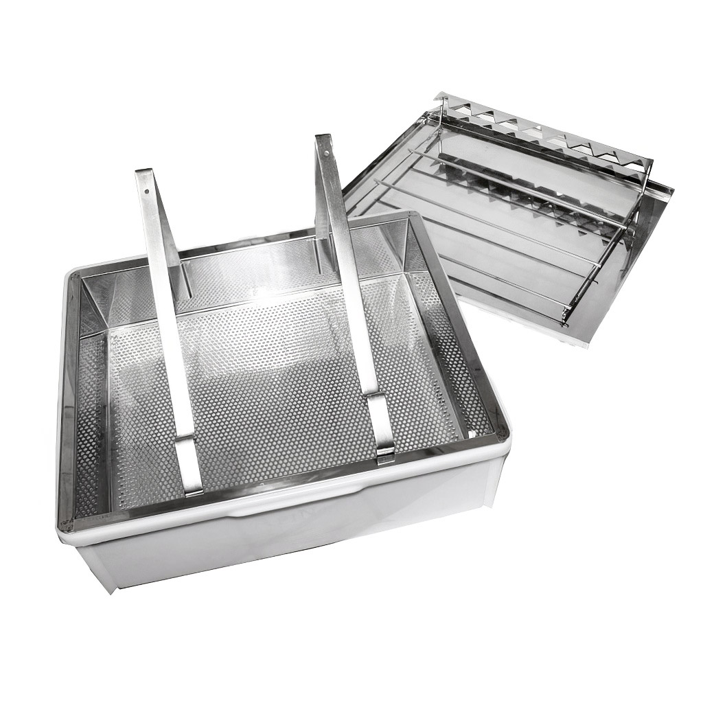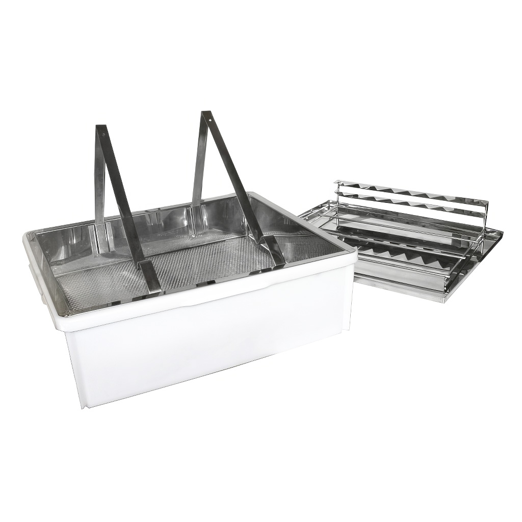 Odvíčkovací sestava s nerezovým sítem pro separaci voskových víček od medu. Rámek se osadí na opěrné hroty, víčka se zachycují na sítu, med samovolně protéká do spodní vany. Součástí je nerezový odkládací podnos pro jeden odvíčkovaný rámek, což urychluje rotaci rámků při sezónním medobraní. Vana z potravinářského plastu snižuje celkovou hmotnost sestavy; nerezové komponenty zajišťují odolnost vůči kyselému prostředí medu a opakované sterilizaci. Vhodné pro hobby i menší provozní medobraní.
