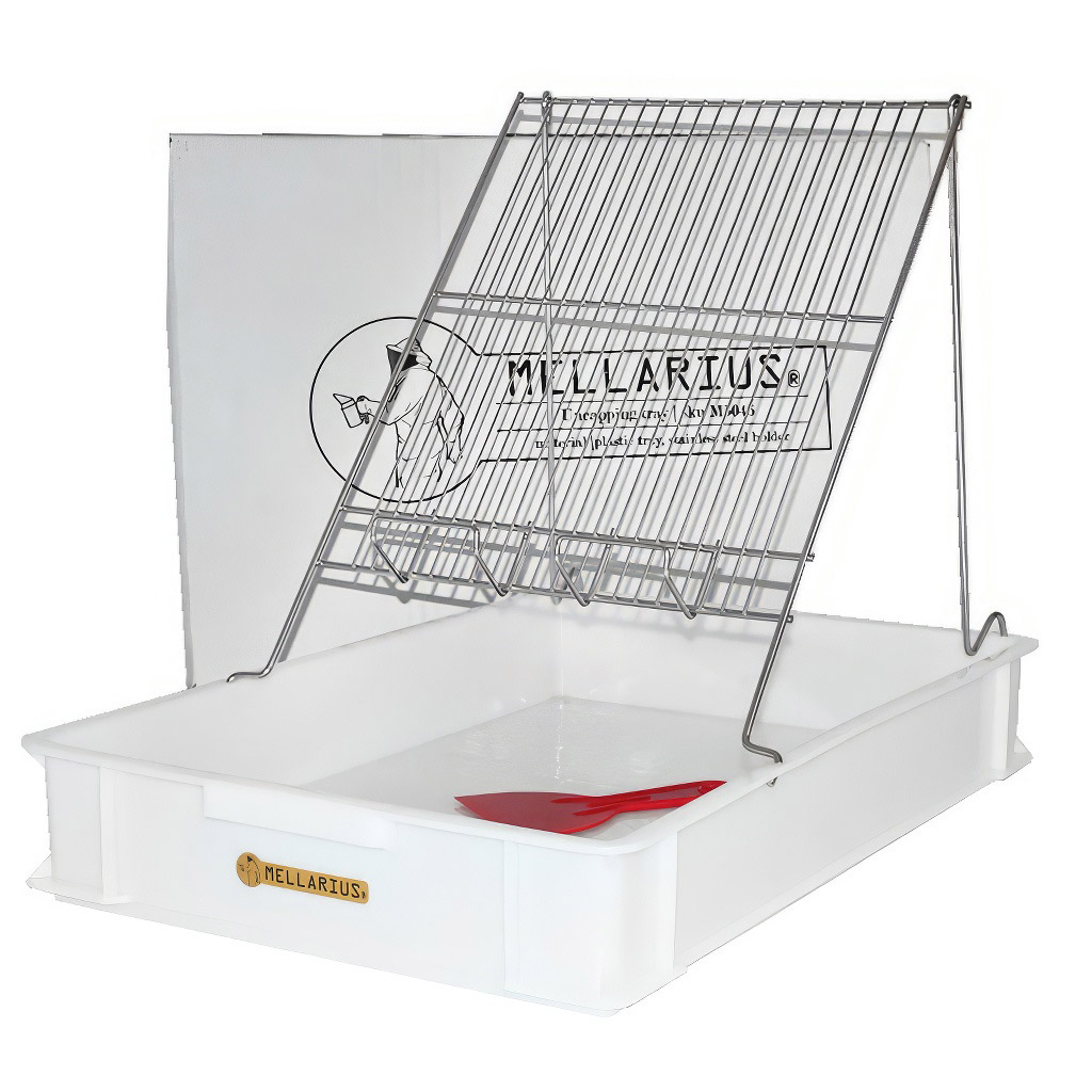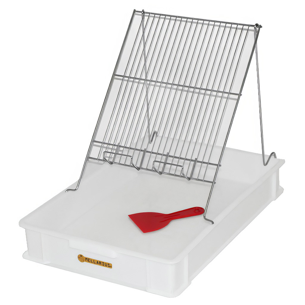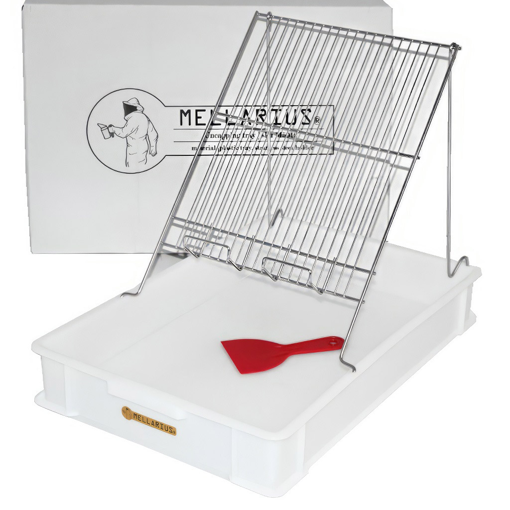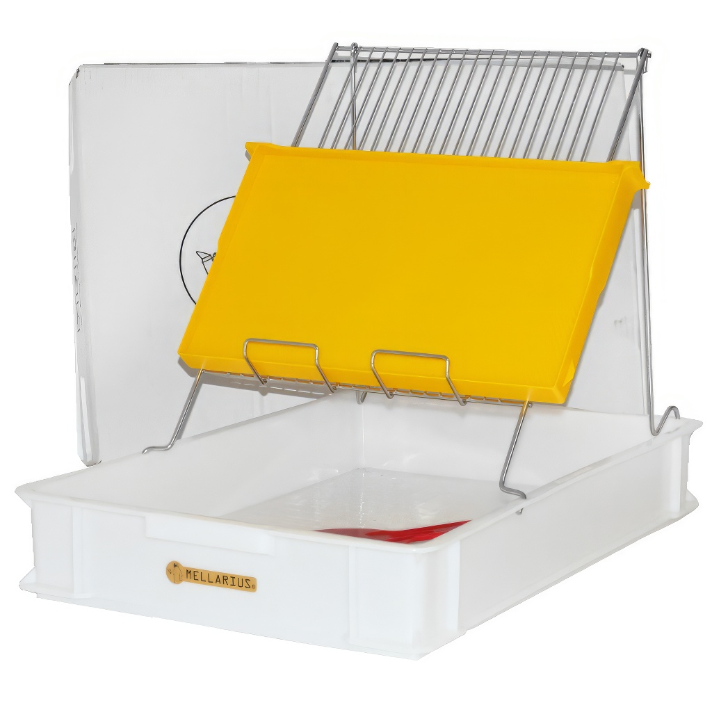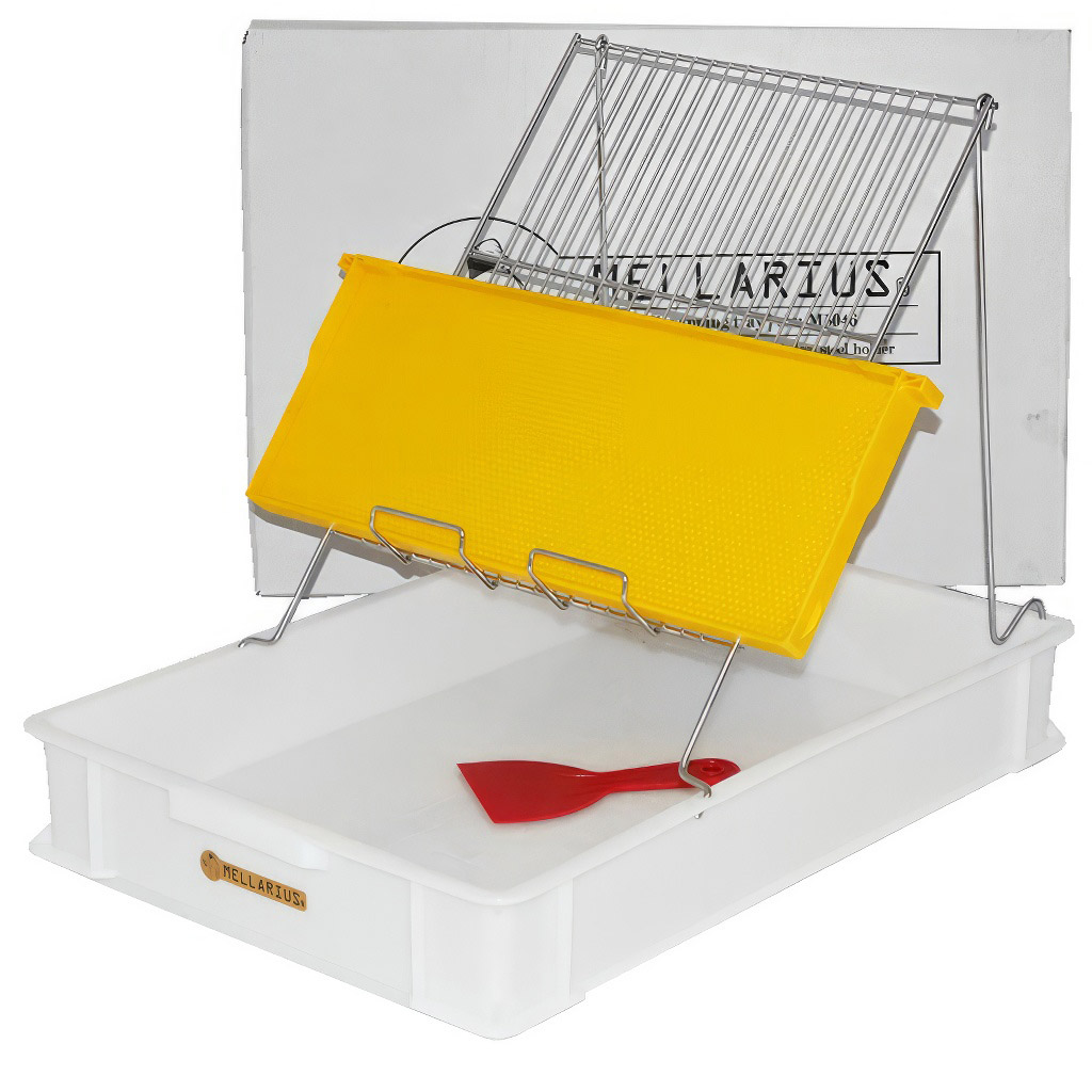 - K čemu slouží odvíčkovací talíř Mellarius?Odvíčkovací talíř slouží k pohodlnému odvíčkování medných rámků před jejich vložením do medometu. Rámek se postaví na nerezový držák a odvíčkovaný vosk s medem padá do plastové vany s děrovaným dnem, kde se med oddělí od víčkového vosku.